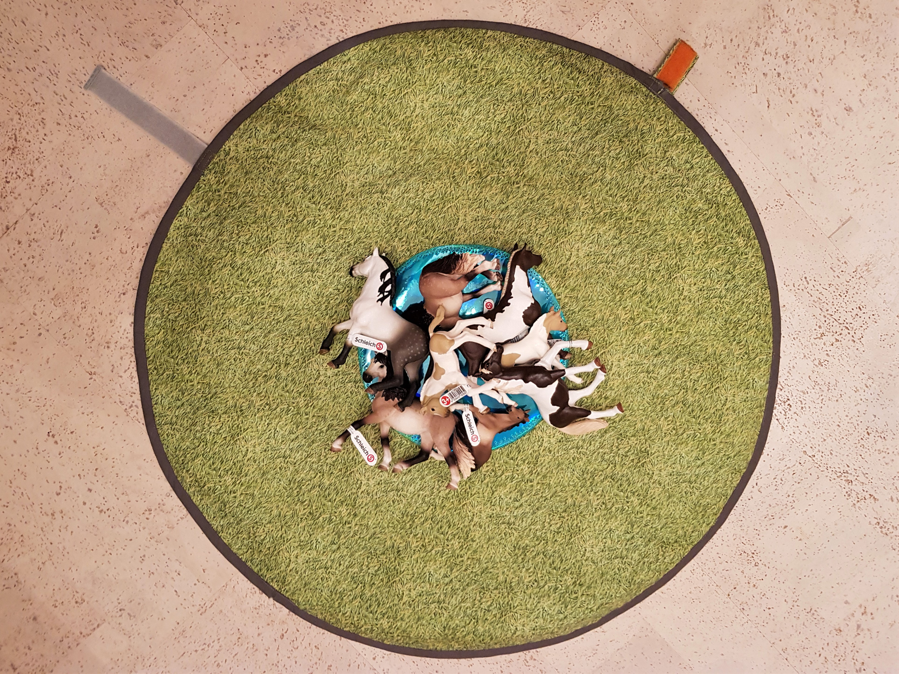 Für ihre Schleichpferde bekam unsere Enkelin eine genähte Pferdewiese mit Teich (Thermolamfüllung und applizierte Hologrammfolie in Wachstuchstärke) mit Klettverschlüssen und Tragegriff.