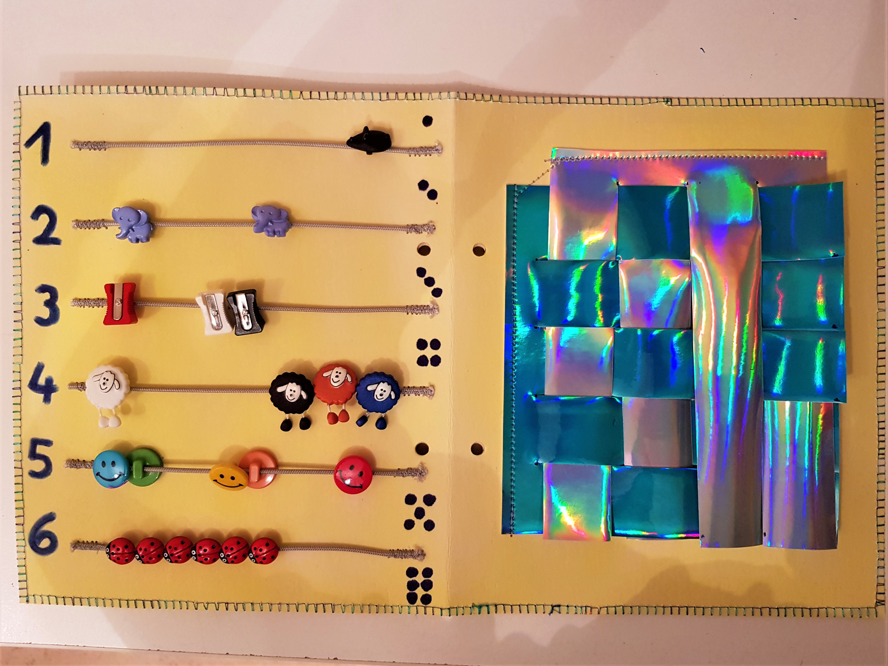 Die Seite zum Zählen ist im Gegensatz zum ersten Quietbook in der anderen Richtung gestaltet, weil die Stege auf der Knopfrückseite senkrecht angebracht waren. Beim ersten Buch waren die Knopfstege waagerecht.