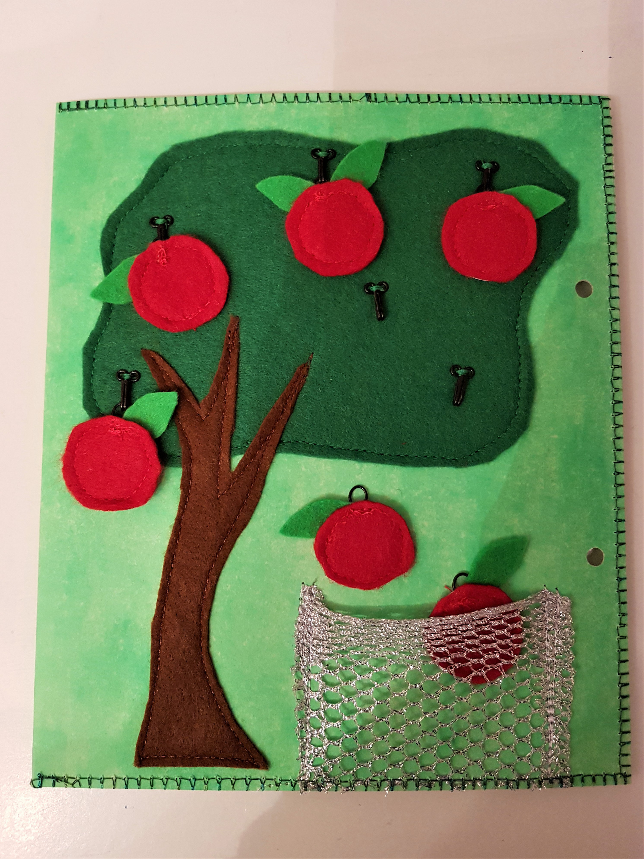 Die Äpfel hängen mit Ösen an den Haken im Apfelbaum. Leider wurde erst beim Live-Kindertest deutlich, dass die Haken hochklappen beim Abpflücken. Außerdem mussten die Haken weiter zugebogen werden, weil die Äpfel sonst beim schräg nach hinten halten sofort runter fielen. Neuere Haken haben einen kleinen Widerstand, der mit der Öse überwunden werden muss, aber ich hatte alte Restbestände verwendet. Nun erfordert das Apfelpflücken besondere Fertigkeiten, aber die Kinder werden es bestimmt schnell lernen.