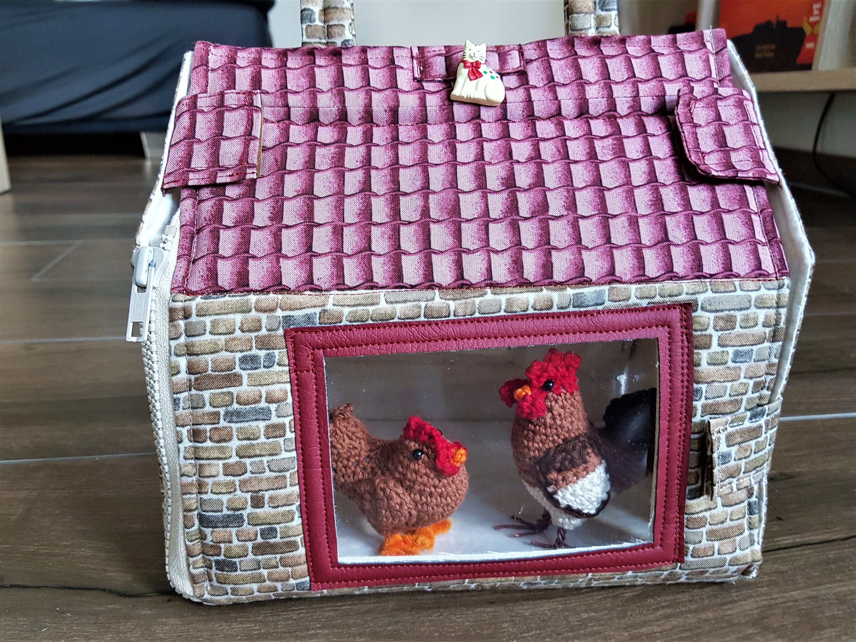In Abwandlung der alten Anleitung von "Made by Marzipan" für ein kleines Spielhaus zum Mitnehmen habe ich einen tragbaren Hühnerstall genäht.