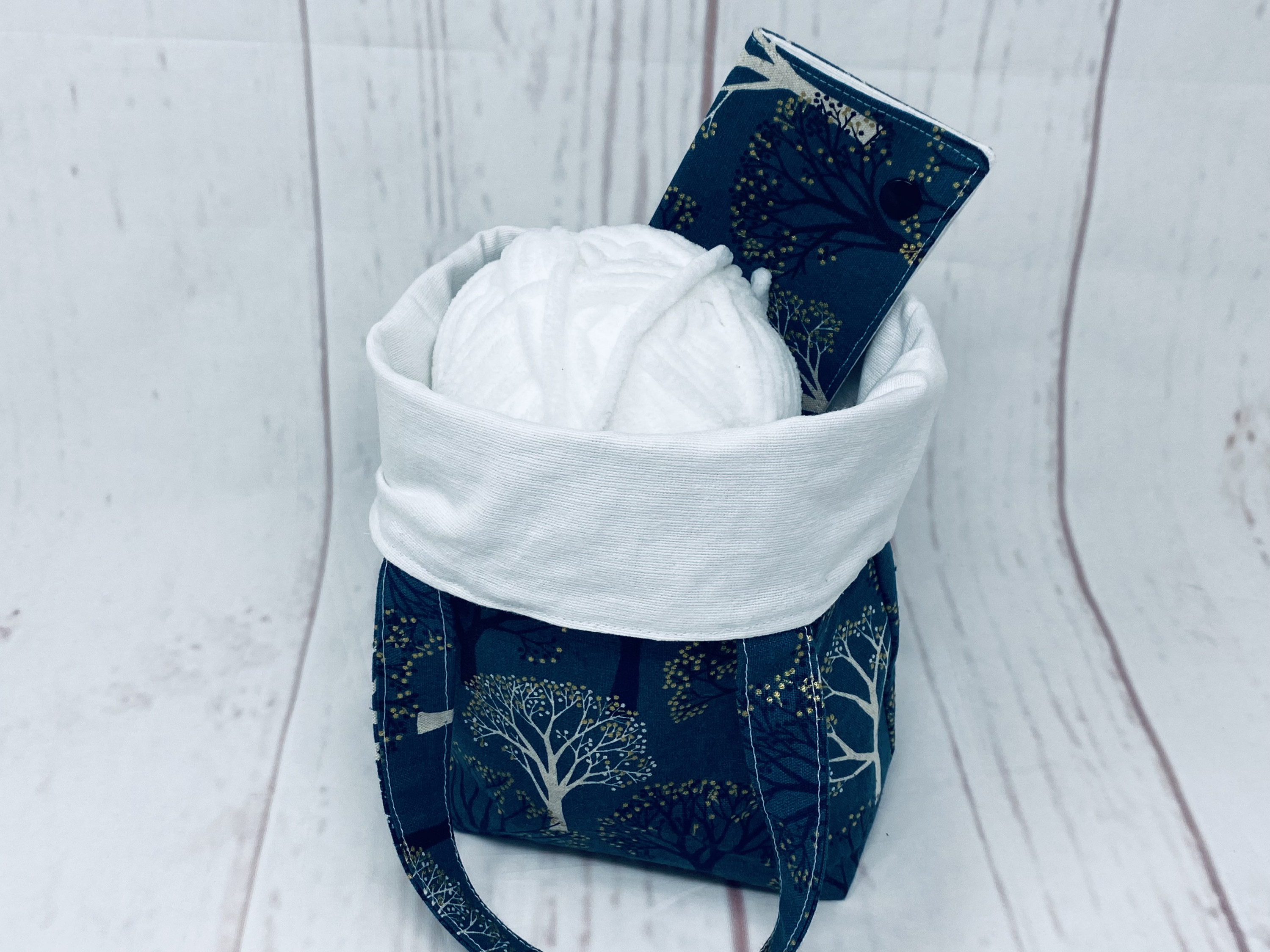 So sieht es aus, wenn die Tasche umgeklappt ist - das Knäul kann drin bleiben, ideal also auch für Bobbel. Kleinere Strickprojekte passen super rein und man kann es mitnehmen. Wartezimmer oder Mittagspause gerettet!