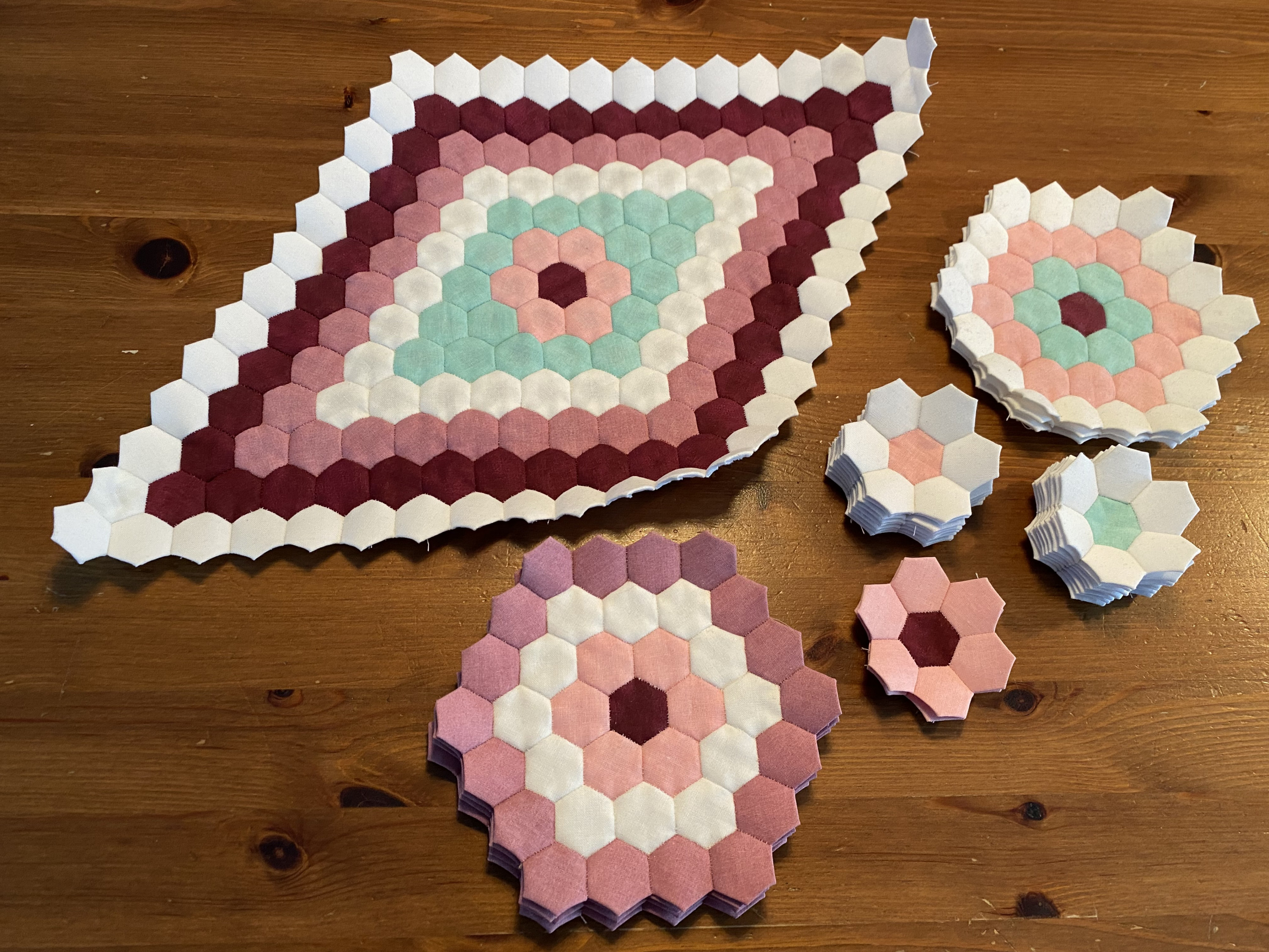 Dies sind alles Hexis, die ich seit Mitte Januar geheftet und vernäht habe. Und die ersten Teile für den Rand. Noch eine Raute und ich habe 1/4 Rand und kann mit annähen und auffüllen des Hintergrunds starten.