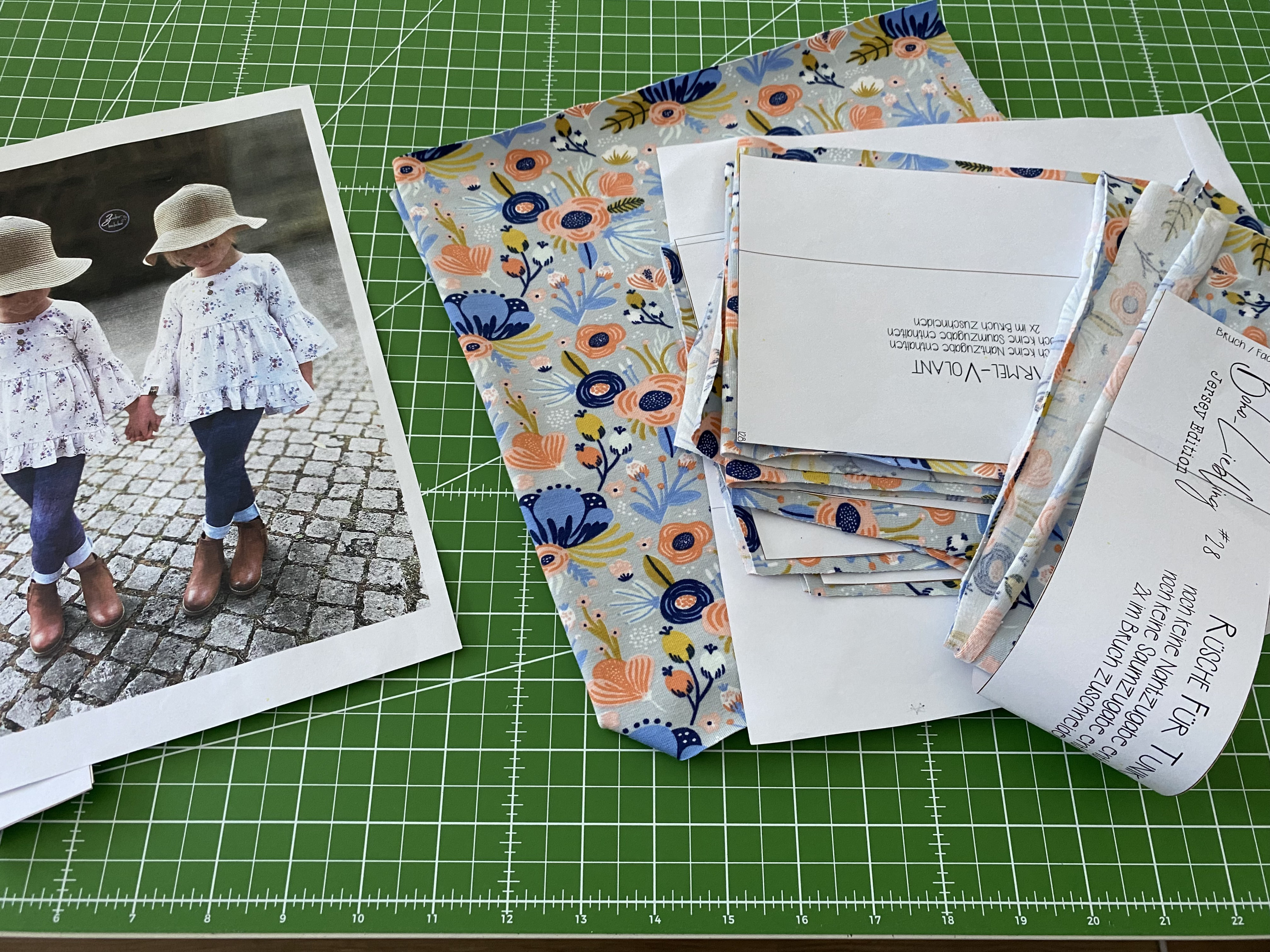 hier der erste Fortschritt - dieser schöne Jersey mit Blumen mit blau und aprikot soll zu einem Boho-Liebling werden in Größe 128.