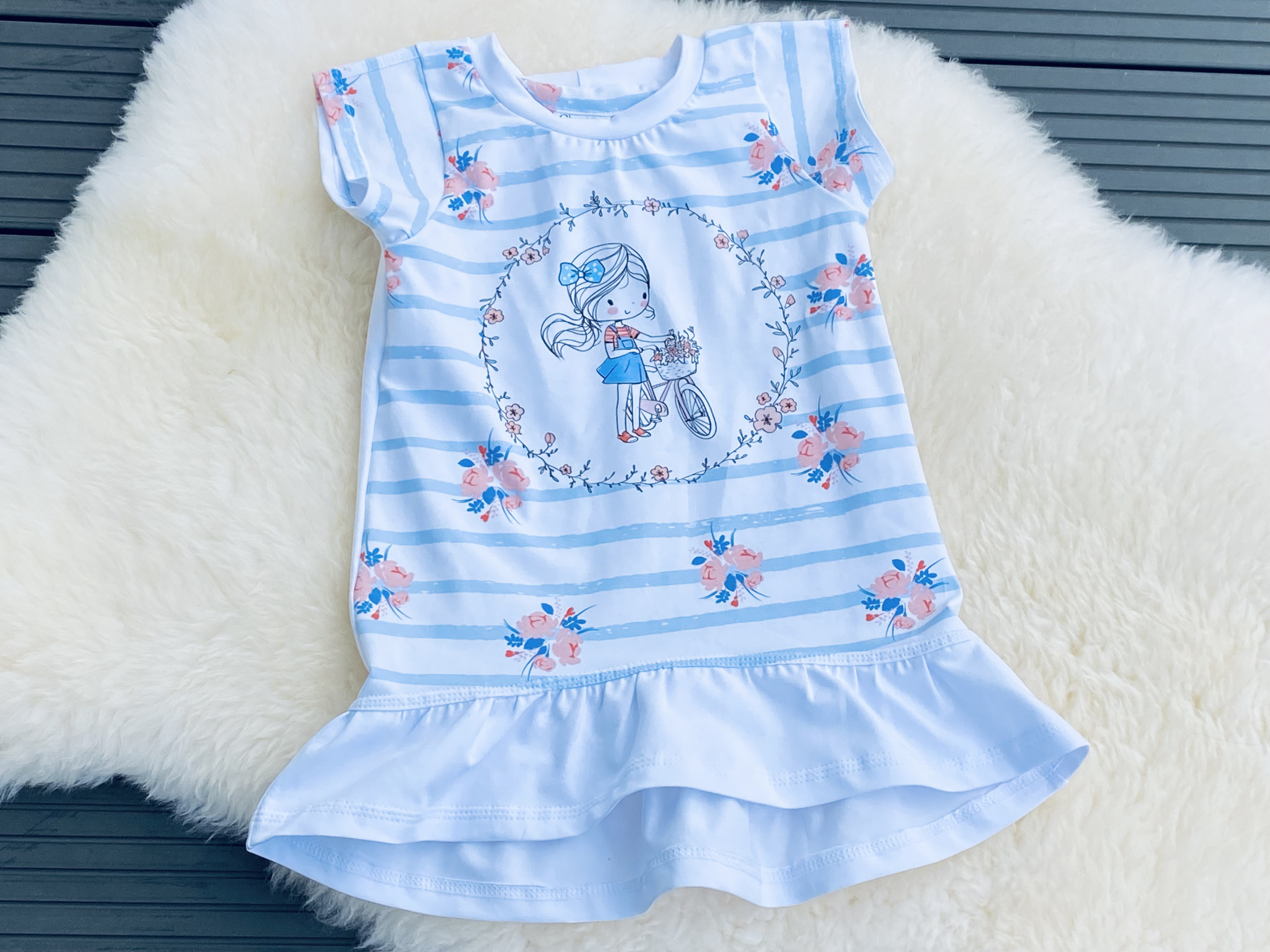 hier das fertige Cutie Shirt nach Schleiferlwerk in Größe 128. Die Rückseite könnt ihr in meinem Jahresbeitrag sehen. Vorderseite und die Ärmelchen habe ich aus dem Panel herausbekommen und der Rest ist weißer Jersey von Swafing aus dem Vorrat.