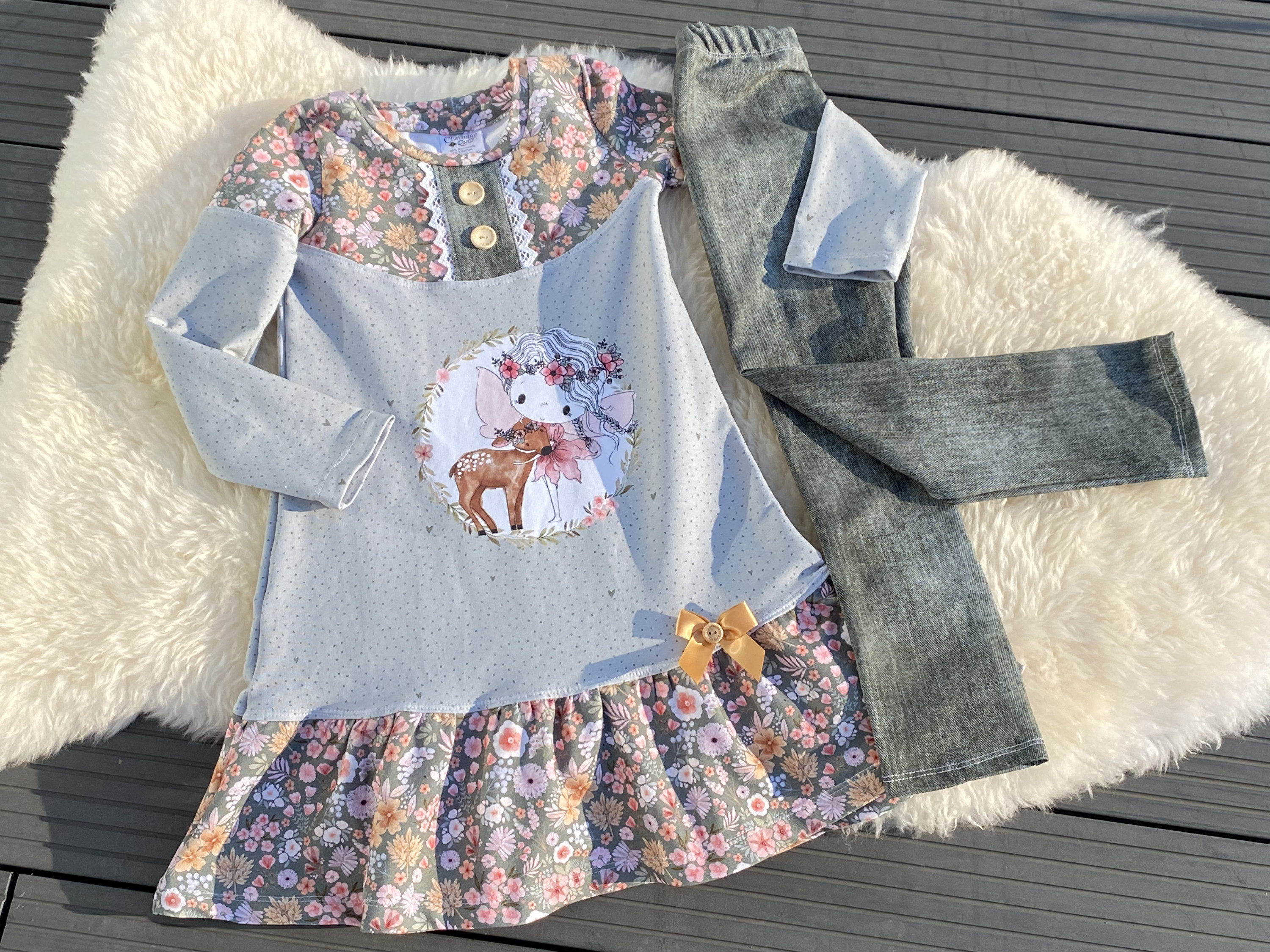 Größe 128 ohne Änderungen, dazu eine Cushy Legs ebenfalls in Gr 128. Leggings ganz schlicht, am Oberteil wieder dezent getüddelt.