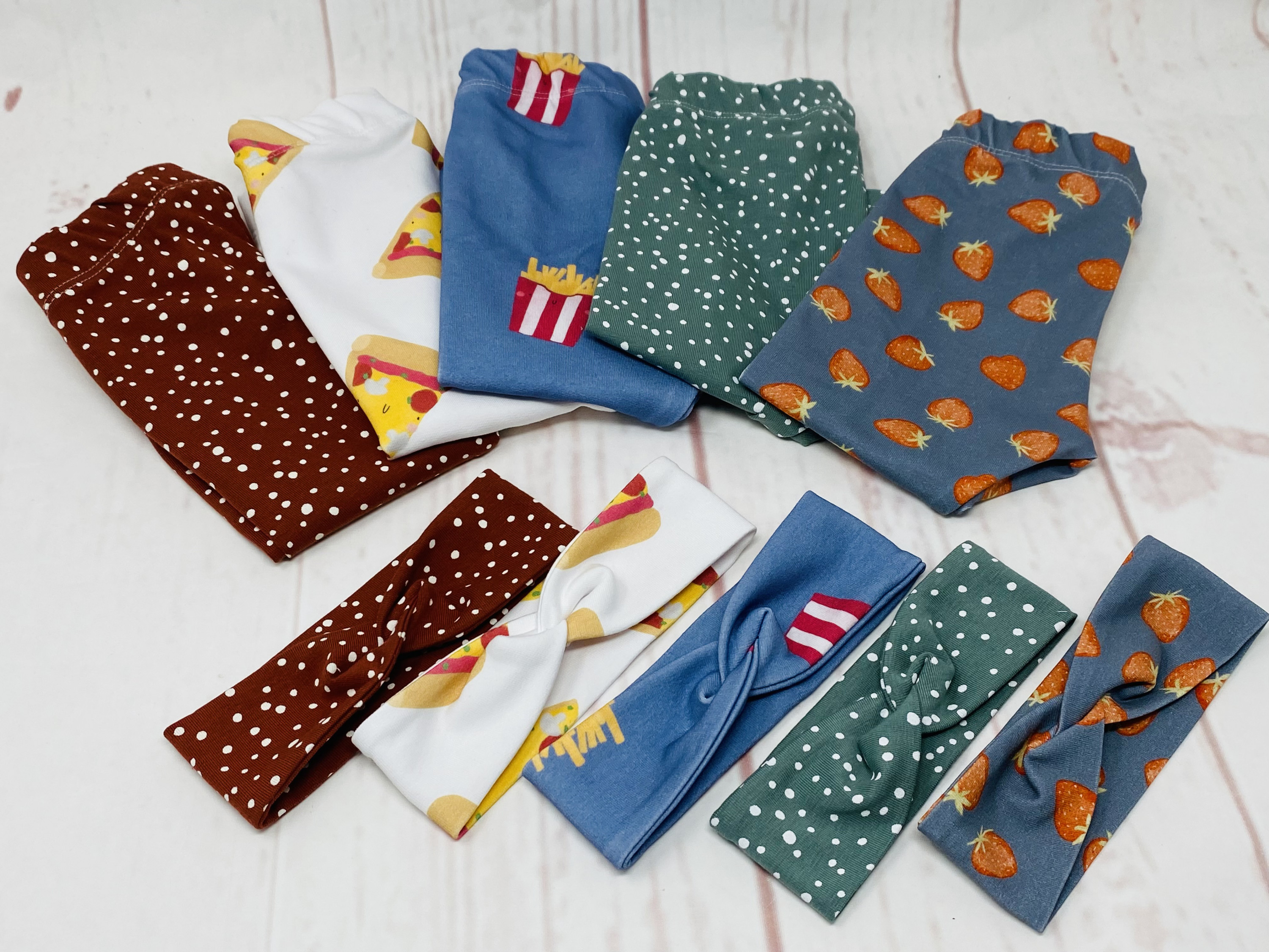 hier kommen die 5 Leggings nach dem Schnitt Cushy Legs von Schleiferlwerk in Größe 68 und dazu passenden Haarbänder nach einem YouTube Video mit dem KU 37 cm.