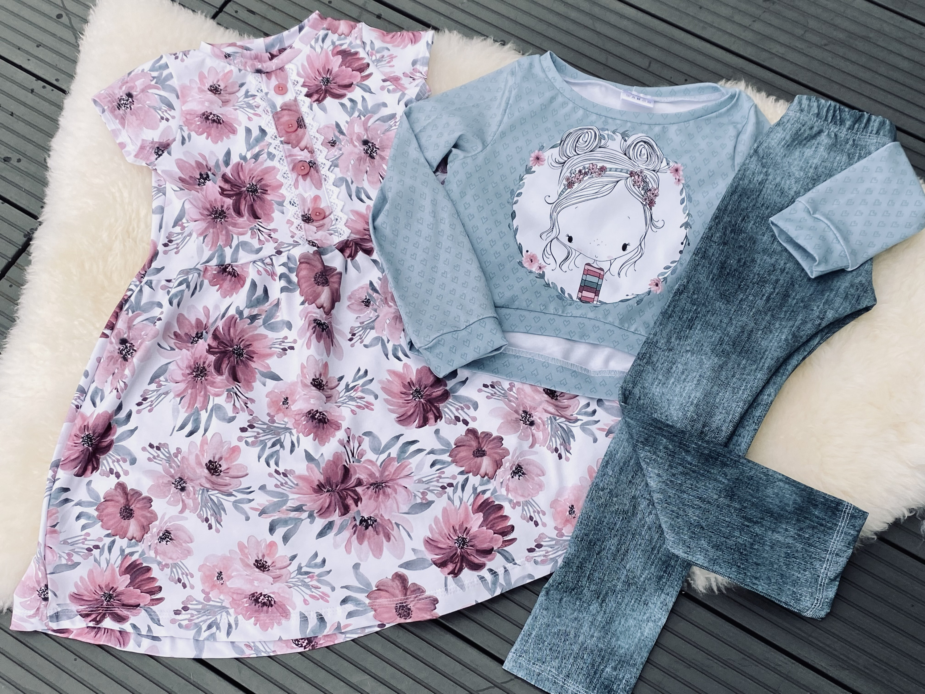 Das Kleid mit kurzen Ärmeln und Fakeknopfleiste am Oberteil hat eine angenehme Länge und kann auch mal solo getragen werden. Dazu kommt eine lange Leggings nach dem Schnitt Cushy Legs von Schleiferlwerk. Und vollständig wird das Trio mit dem Croppulli nach dem Schnitt Amy von Meine Herzenswelt.