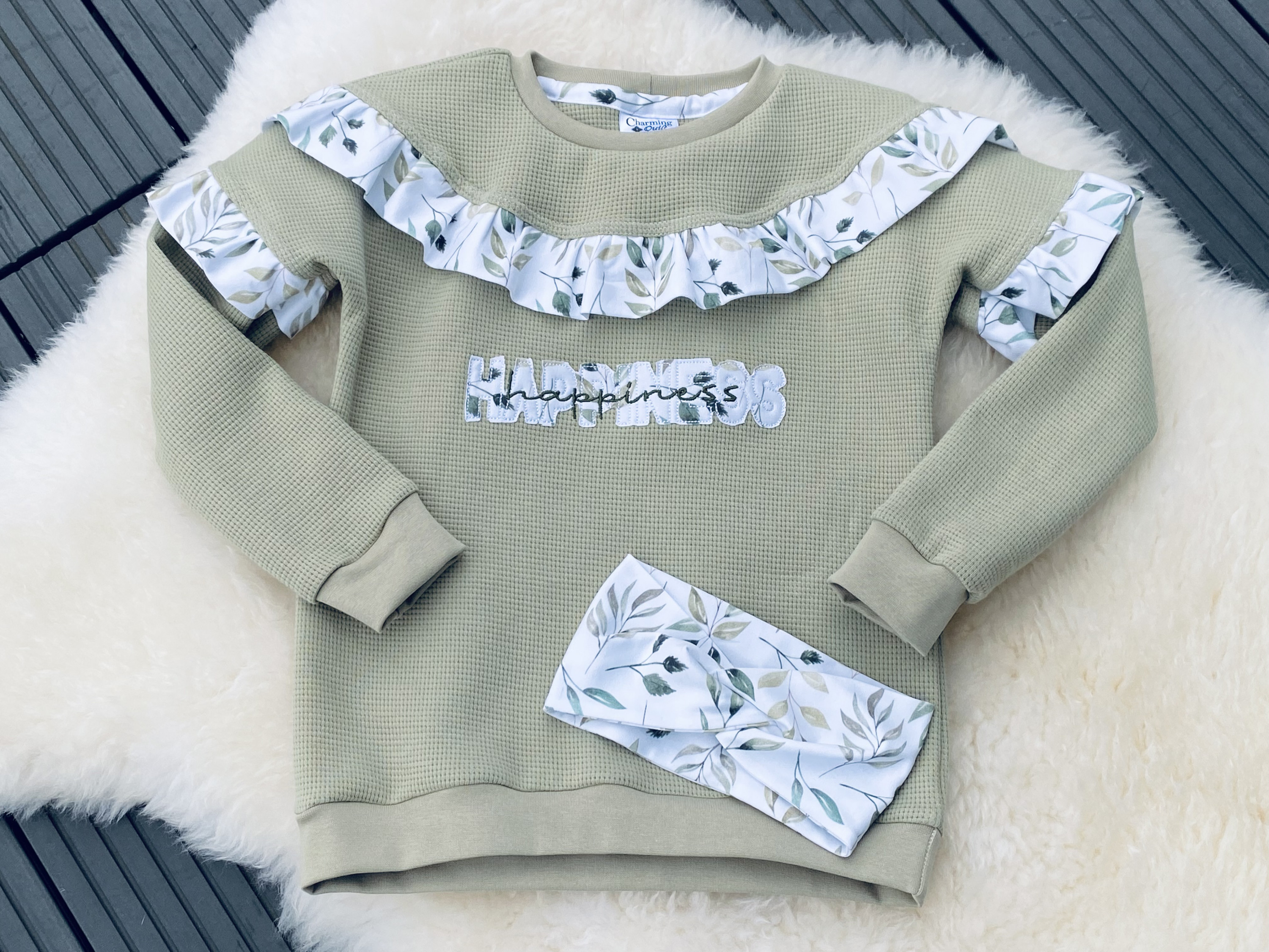 und hier unser Outfit für den Flug: ein Dainty Sweater in salbeigrün mit neuer Stickdatei "Happiness" - kombiniert mit Resten des Blätterjerseys und dazu gabs noch ein Knotenhaarband.