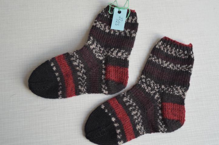 Der Rest vom Restknäul 4-fädiges Sockengarn aus Rufie's Restekiste hat für Mini-Stinos in Gr 22-23 fast gereicht. Gestrickt habe ich mit Nadelspiel 2. Für die Spitze musste ich noch ein wenig uni Schwarz von einem anderen Rest zufügen.