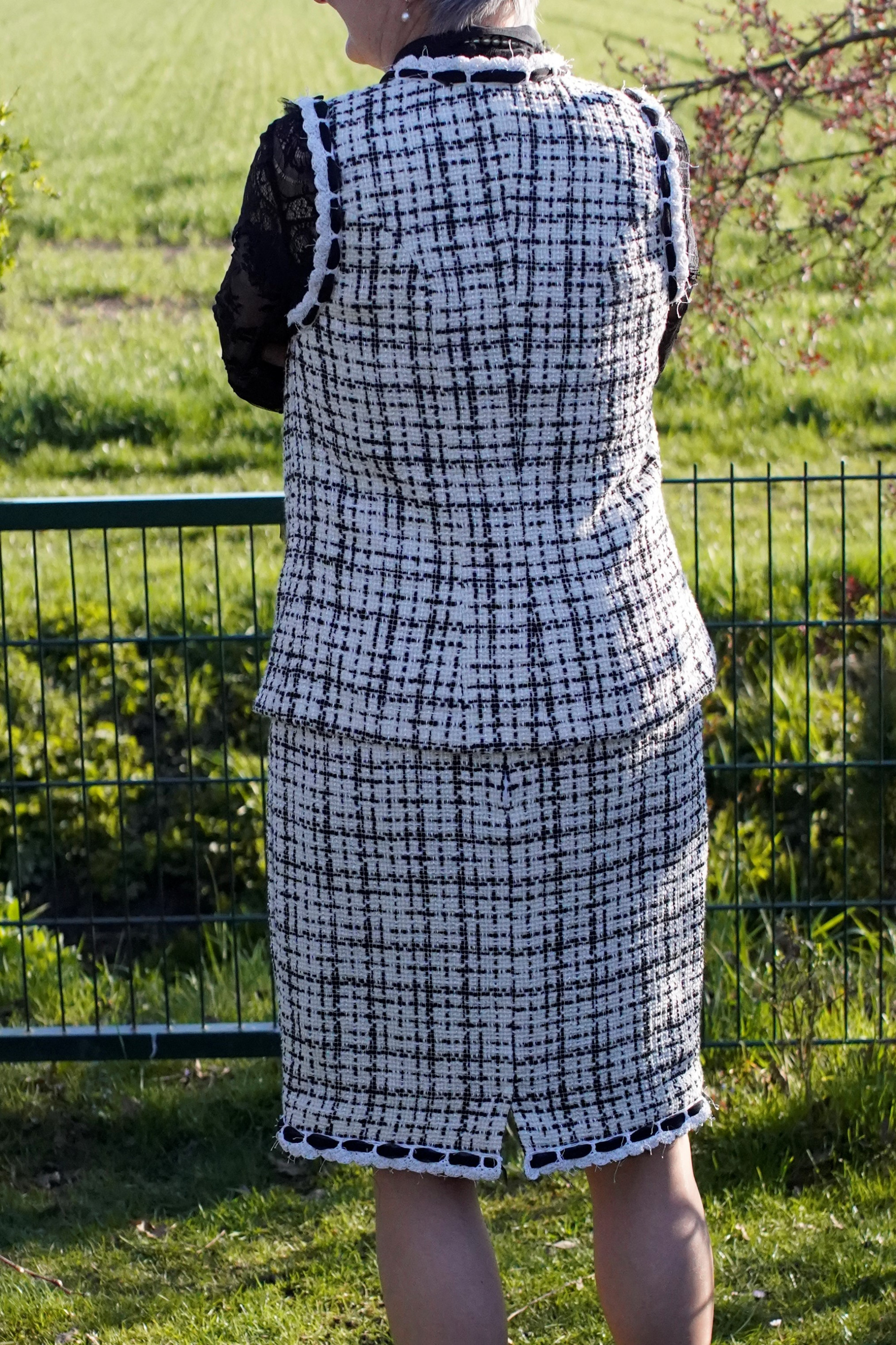Weste und Rock entstanden während einer Designer Challenge. Die Schnitte sind für meine Figur angepasst, die Weste verlängert und begradigt. Das Seidenfutter habe ich, nach Claire Shaeffer, gequiltet und weitgehendst per Hand genäht. Die Borte ist von mir entwickelt und gehäkelt. Die Vorlage für das Modell ist eine Chanel Longvest aus dem Jahr 2005.