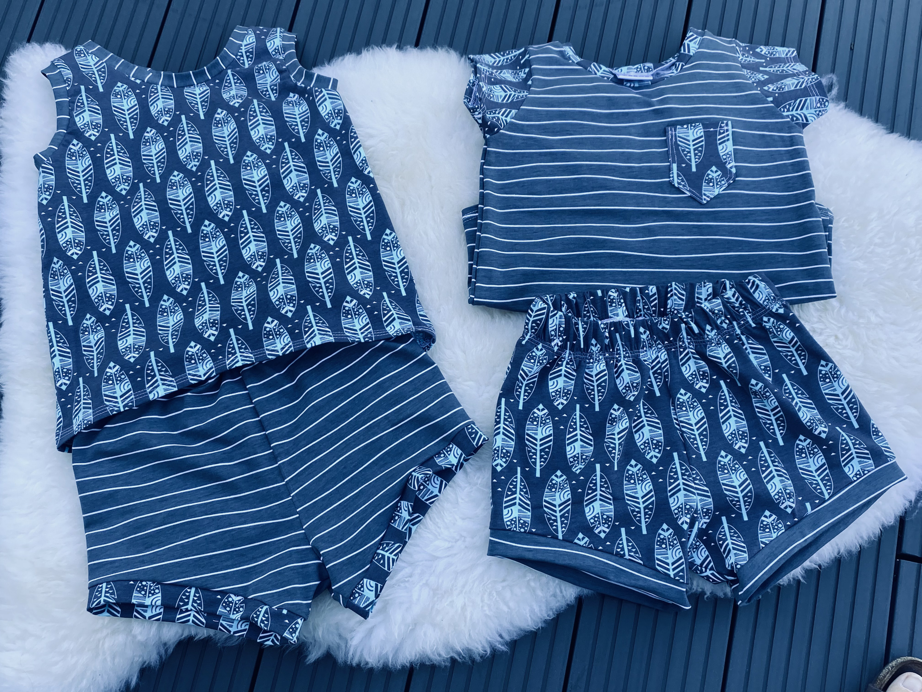 Die Schnitte sind Sunny Shorts und Cutie Shirt von Schleiferlwerk ohne Änderungen. Auf dem einen Shirt habe ich eine Fake-Brusttasche aufgenäht - nur zum Aufpimpen, mir war danach. Beim anderen Shirt habe ich einfach auf die Ärmel verzichtet und Bündchen angenäht - jetzt muss das Murmelchen nicht mehr schwitzen.