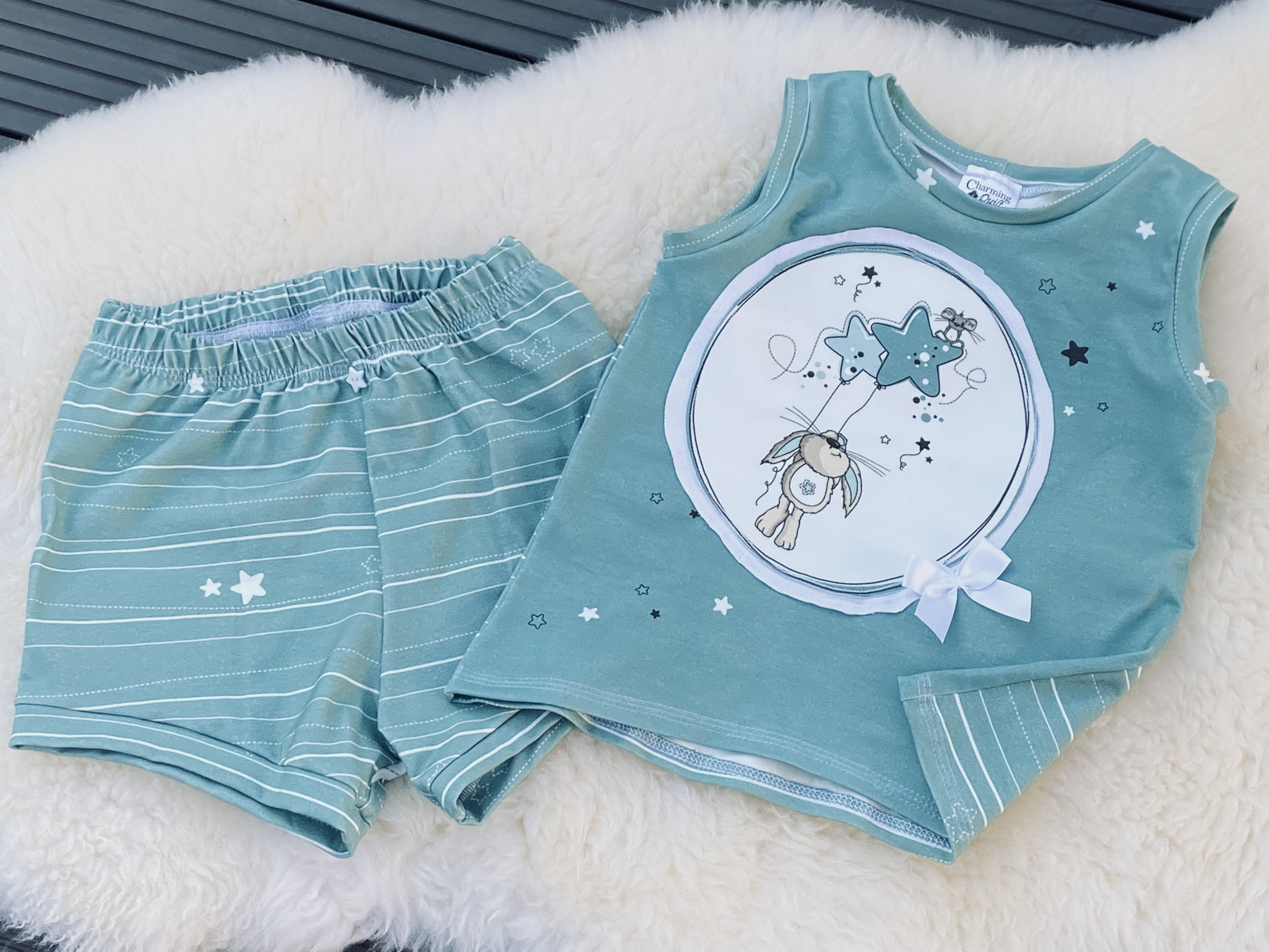 heute habe ich noch zwischendurch endlich den Shorty für die Murmel fertig gemacht. Bei der Hose fehlte nur noch der Gummi und am Shirt nur noch die Bündchen.