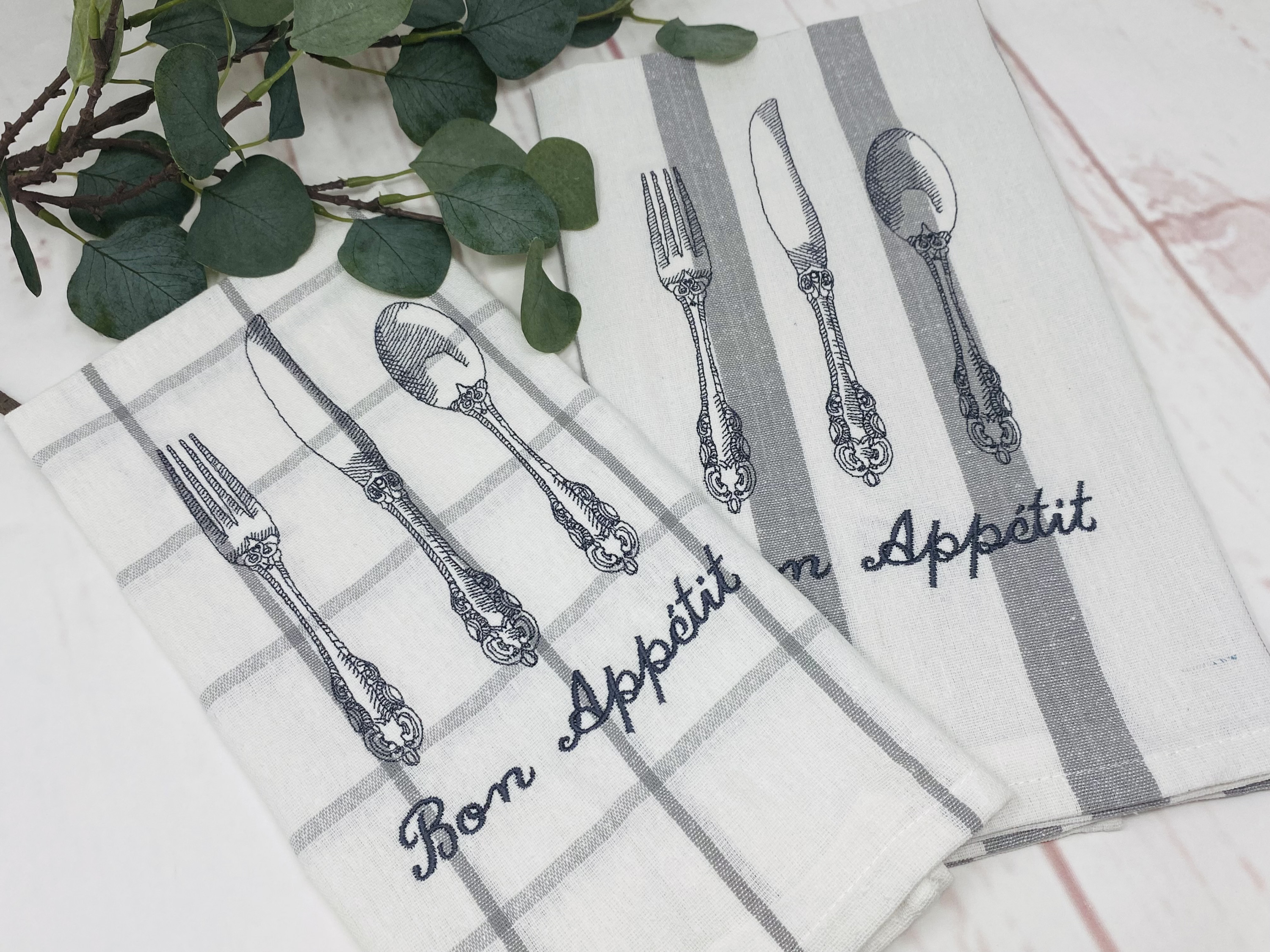 Ich habe ihr die zwei Handtücher bestickt und gewählt haben wir das schöne "Bon Appetit" Stickmuster. Das verschenke ich selbst auch sehr gerne, weil ich es total edel finde.