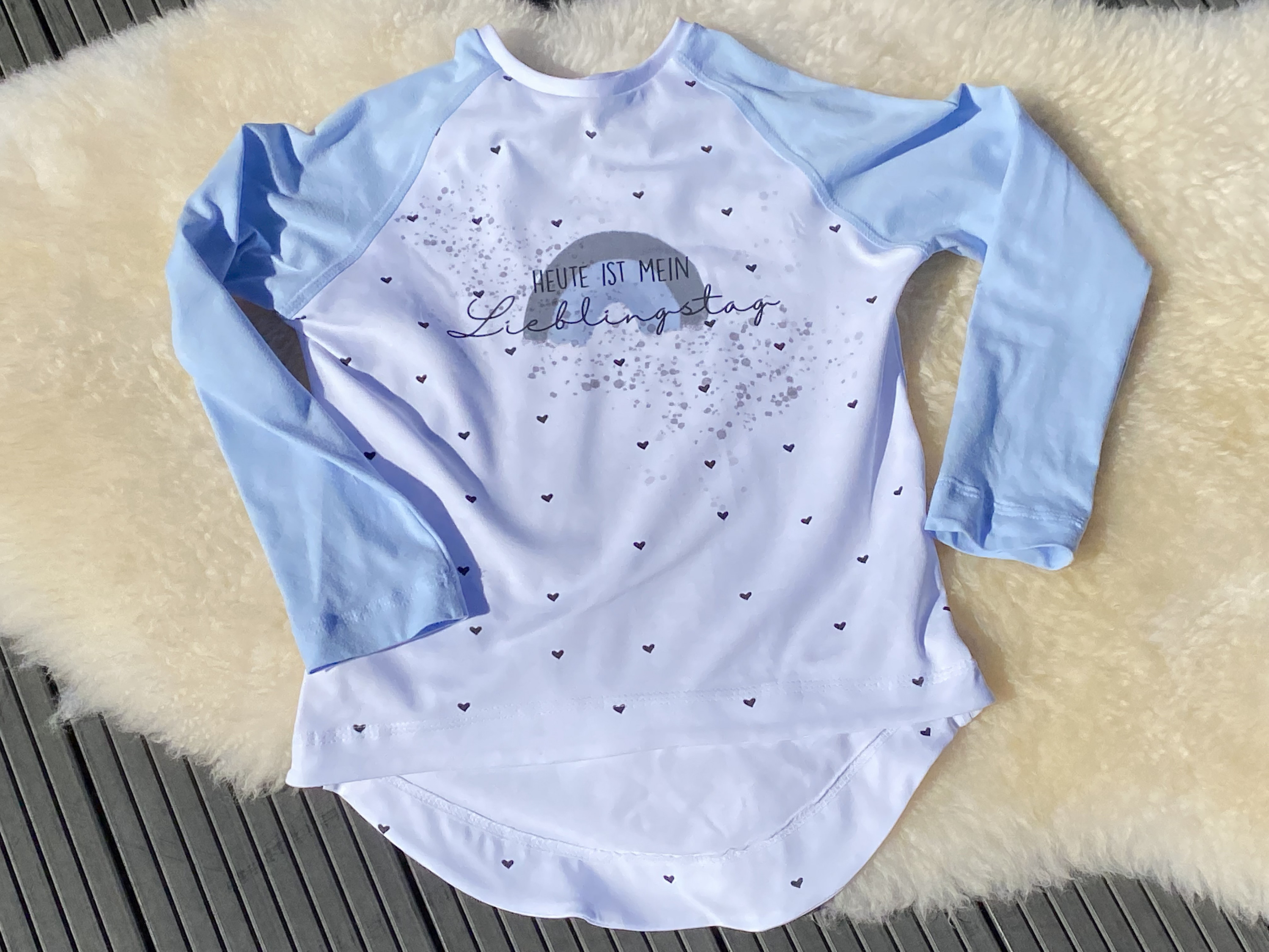 Dazu den Rücken in uni weiß und hellblaue Ärmel.