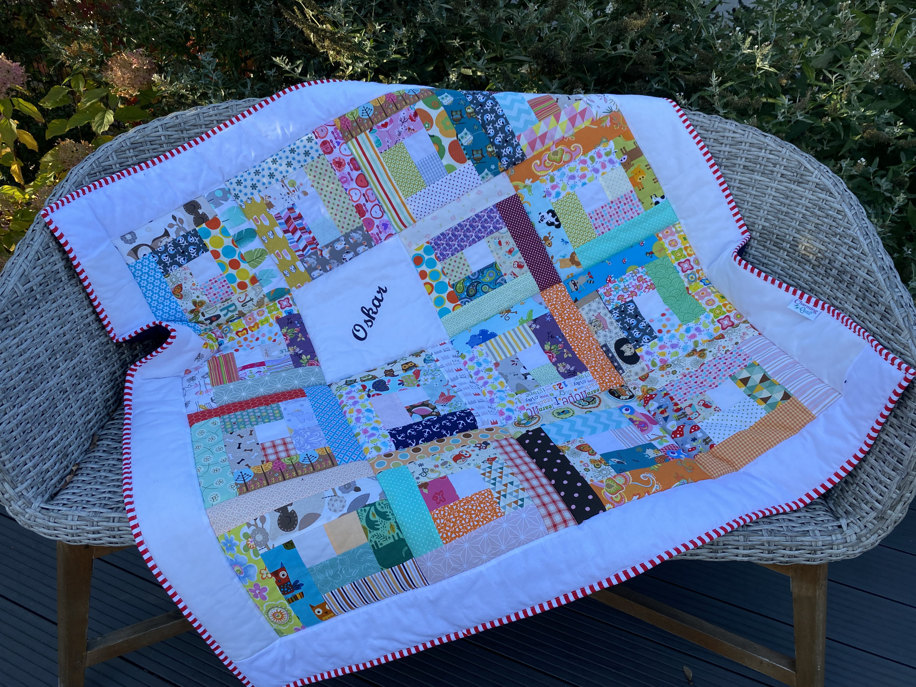 Diese hier ist exakt gleich wie die Decke von Mads. Nur die Stoffe sind kunterbunt und kaum einer ist doppelt. Das Binding hier ist rot-weiß geringelt.