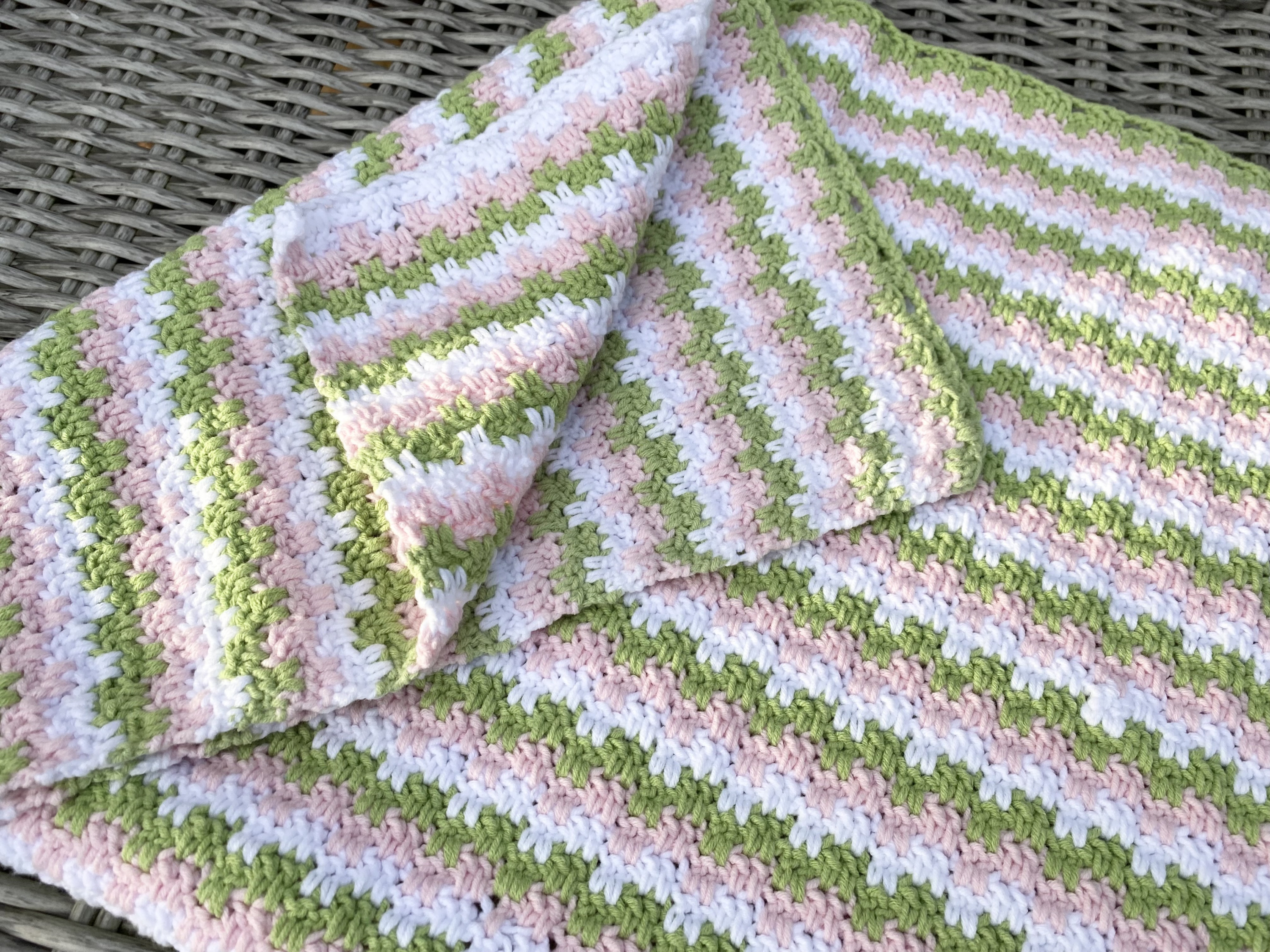 endlich mal fotografiert: die Babydecke in weiß, rosa und grün. Sie ist ca 65x80 cm groß und aus dem Babygarn "Josy" gehäkelt. Das Muster weiß ich nicht mehr, war aus dem Netz/YouTube.