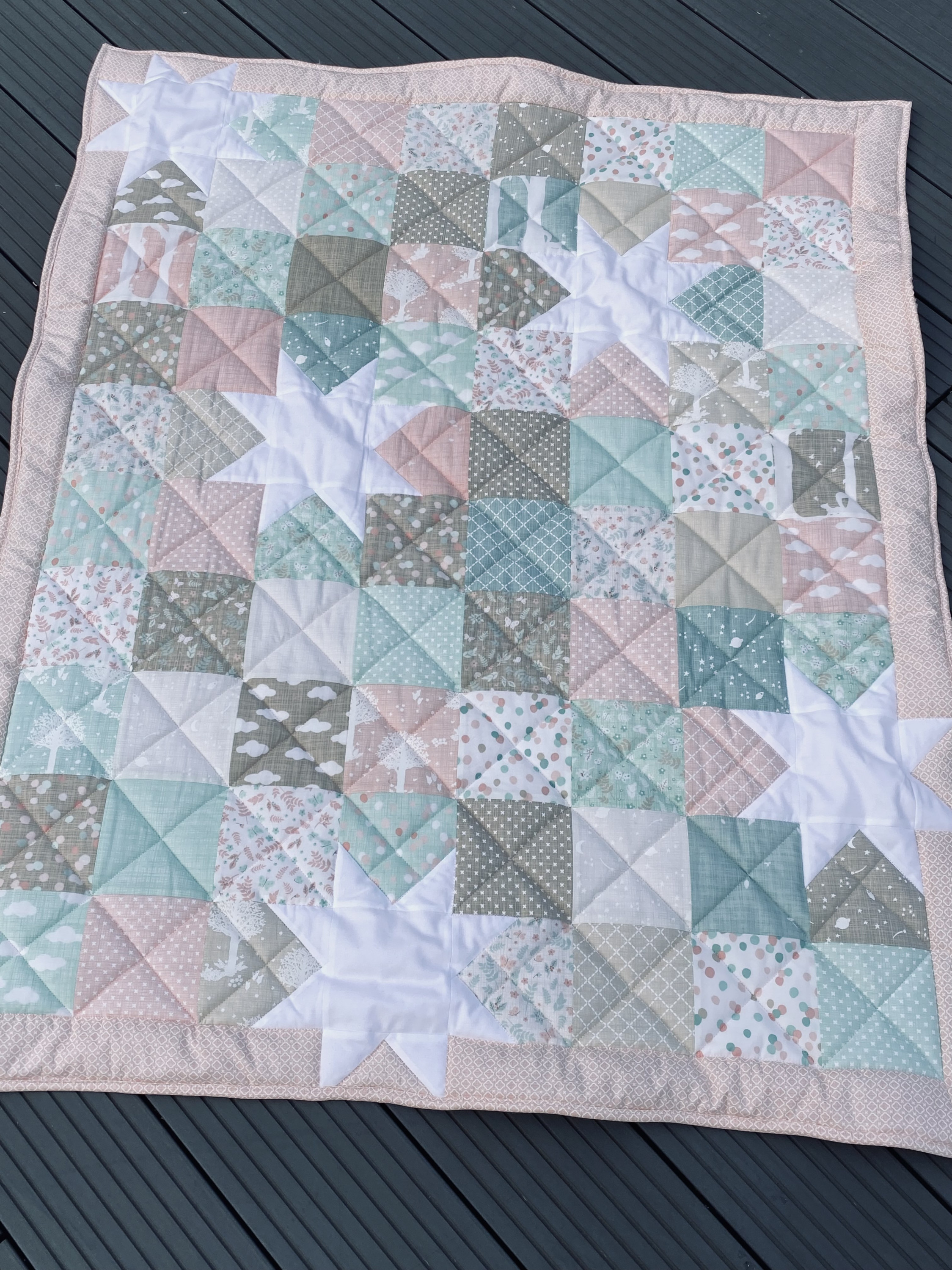 Einfach gequiltet mit diagonalen Kreuzen in den einzelnen Charms. Mehr verträgt die Decke meiner Meinung nach nicht.