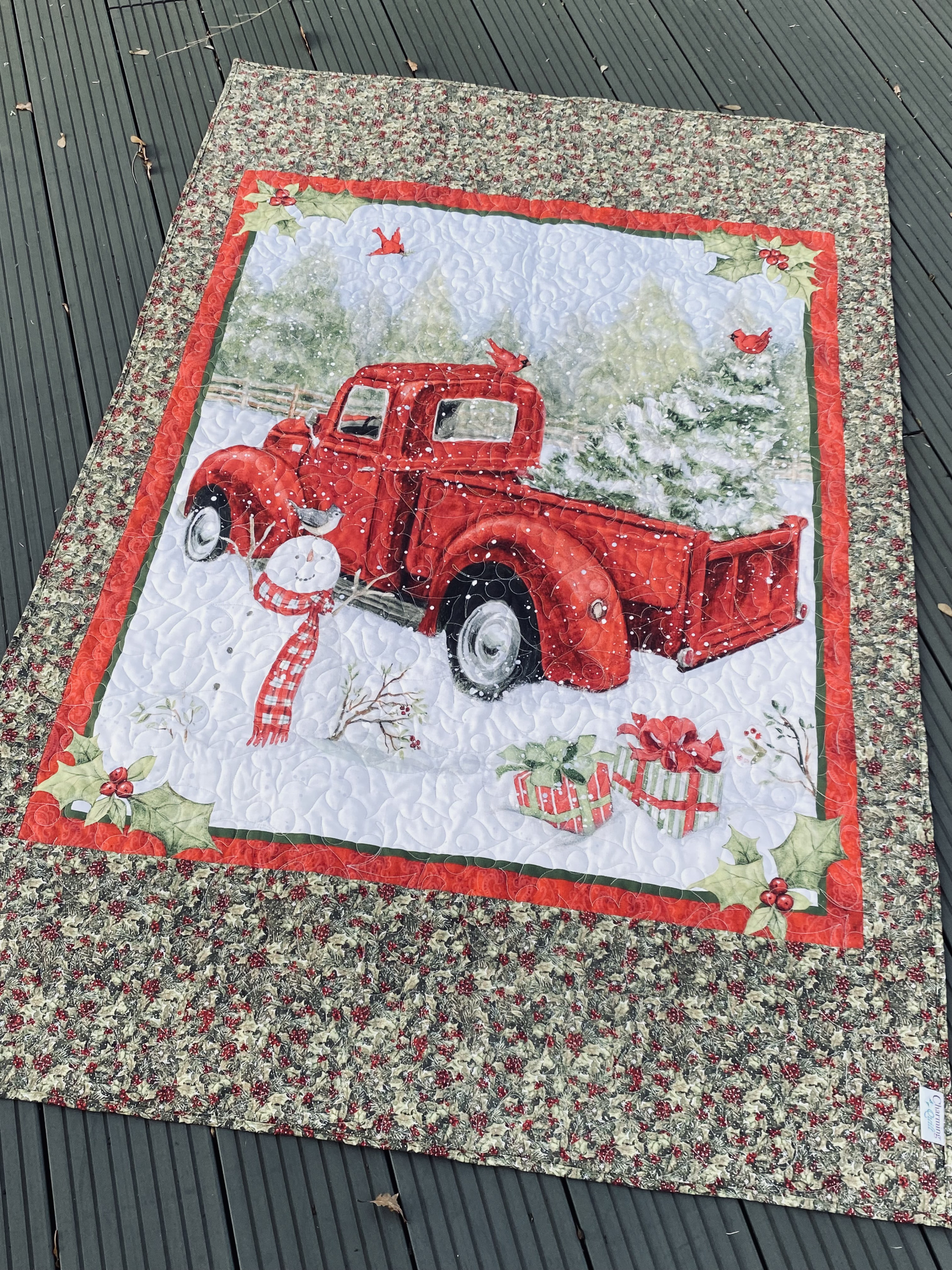 Aus dem Christmas Truck Panel habe ich eine Couchdecke für ihn genäht und gequiltet. Um auf die richtige Größe zu kommen, habe ich noch eine Bordüre angenäht. Diese ist aus kleinen Ilexzweigen und mit ein wenig Goldglitzer. Die Rückseite ist ein allover Druck mit kleineren roten Trucks und gequiltet habe ich ebenfalls Ilex als Allover in einem hellen grau.