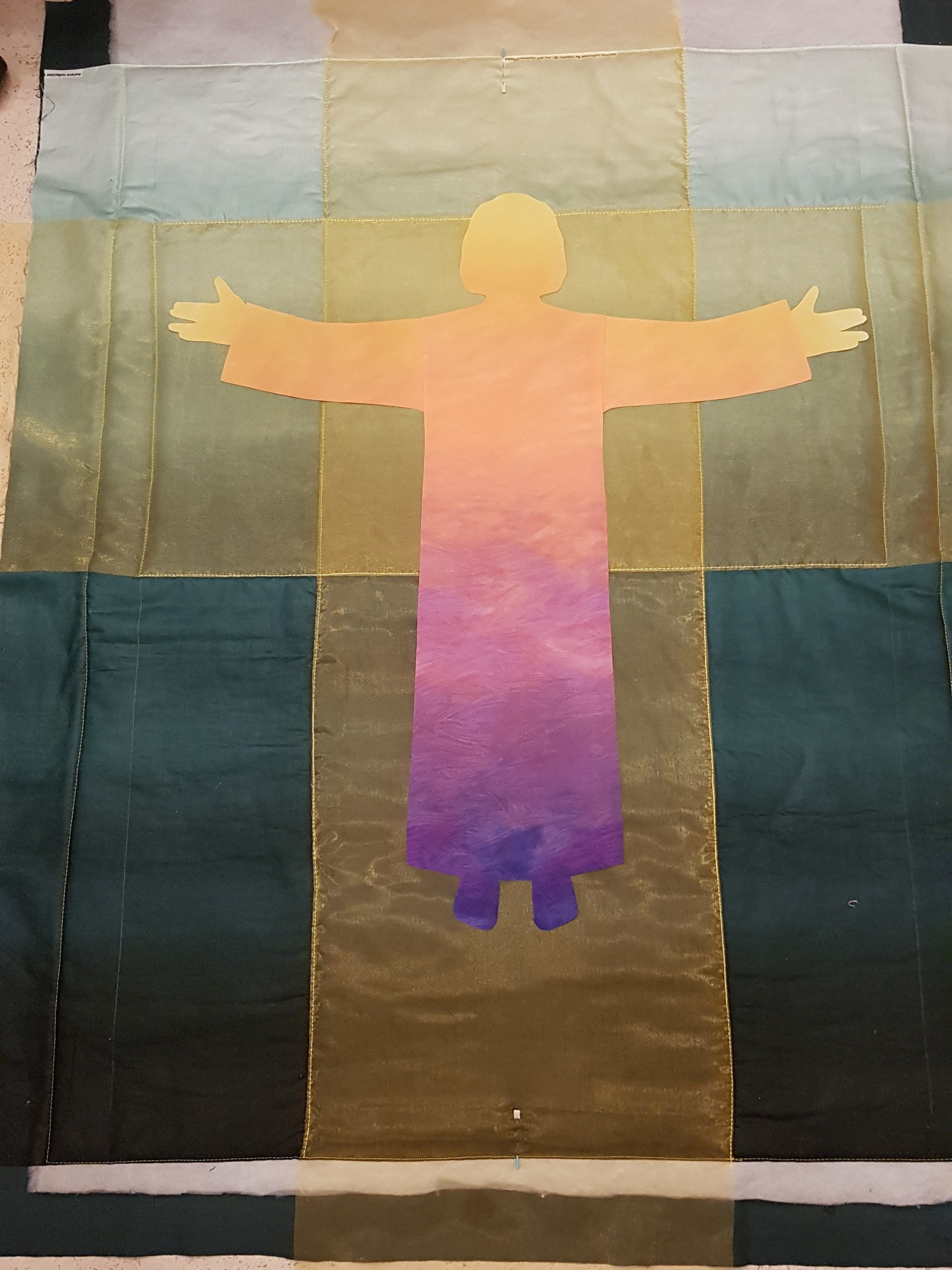 Zuerst ist nur die "nackte Kanzel" zu sehen, dann die zur Probe gelegten Stoffe (Baumwollstoffe im Farbverlauf und gelber Organza), dann die Schablonen, dann die Quiltlinien, schließlich die aufgebügelte Figur und dann die Maschinenstickereien als Schrift und gequiltete Symbole.