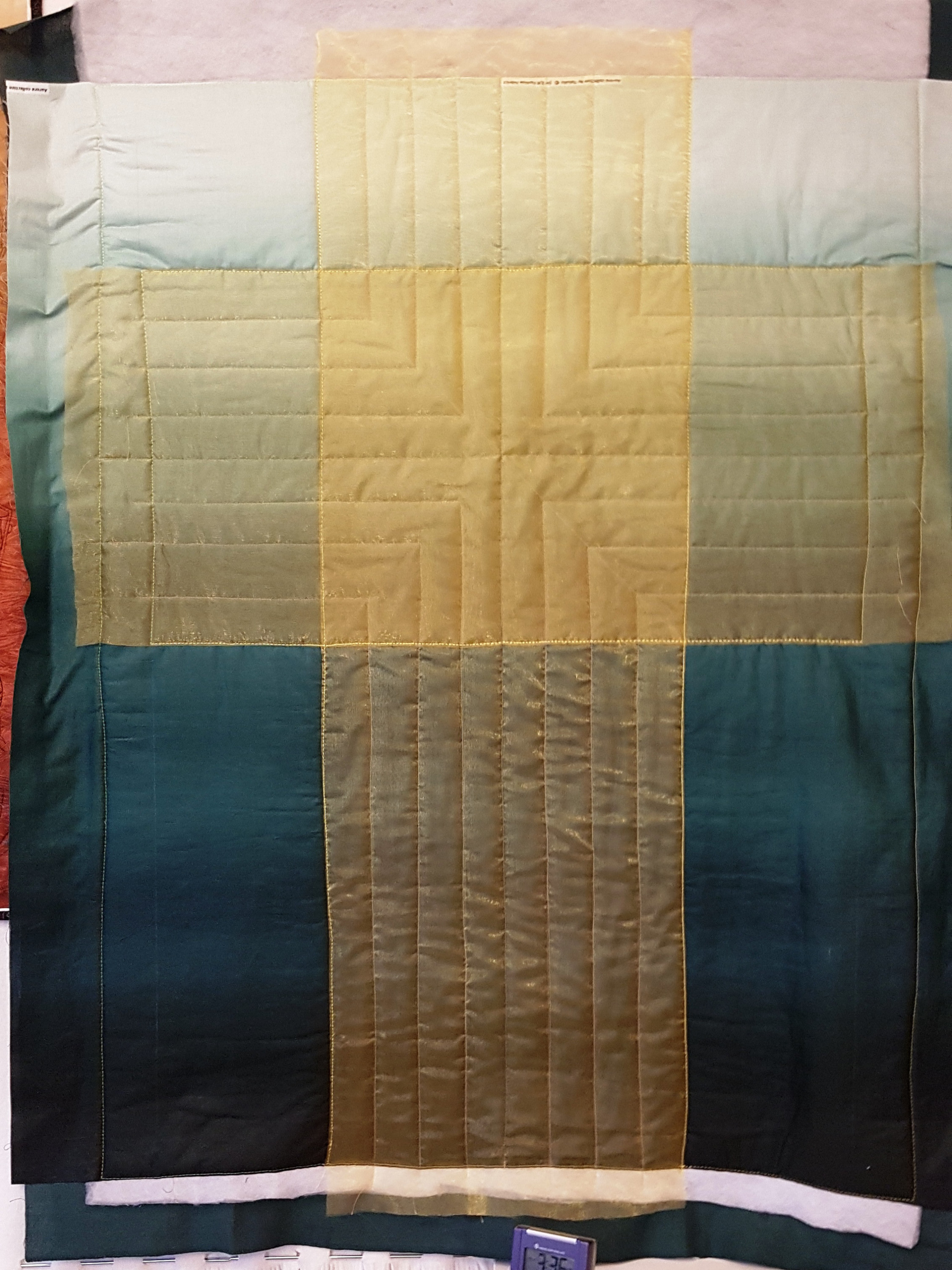 Zuerst ist nur die "nackte Kanzel" zu sehen, dann die zur Probe gelegten Stoffe (Baumwollstoffe im Farbverlauf und gelber Organza), dann die Schablonen, dann die Quiltlinien, schließlich die aufgebügelte Figur und dann die Maschinenstickereien als Schrift und gequiltete Symbole.