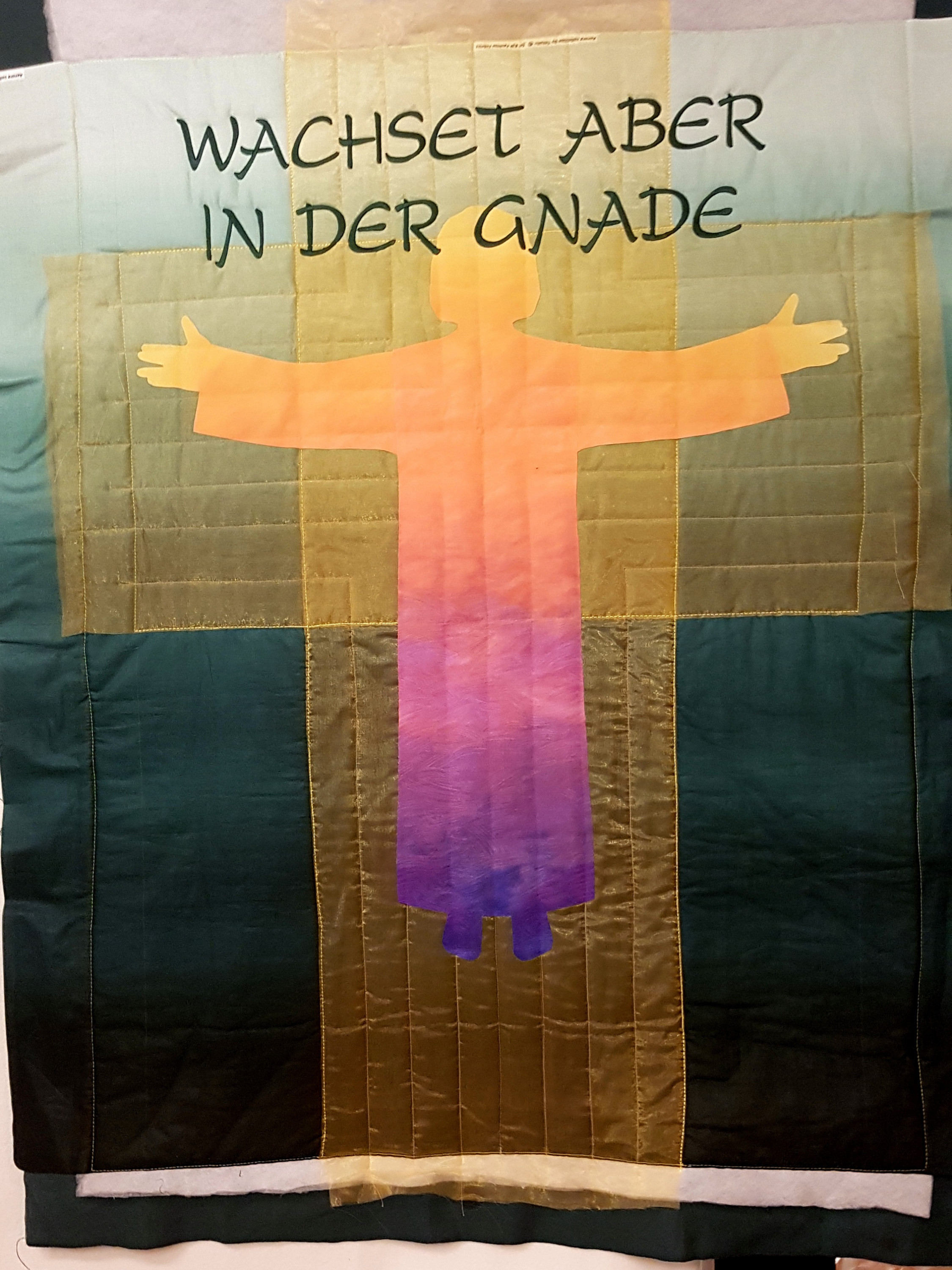Zuerst ist nur die "nackte Kanzel" zu sehen, dann die zur Probe gelegten Stoffe (Baumwollstoffe im Farbverlauf und gelber Organza), dann die Schablonen, dann die Quiltlinien, schließlich die aufgebügelte Figur und dann die Maschinenstickereien als Schrift und gequiltete Symbole.