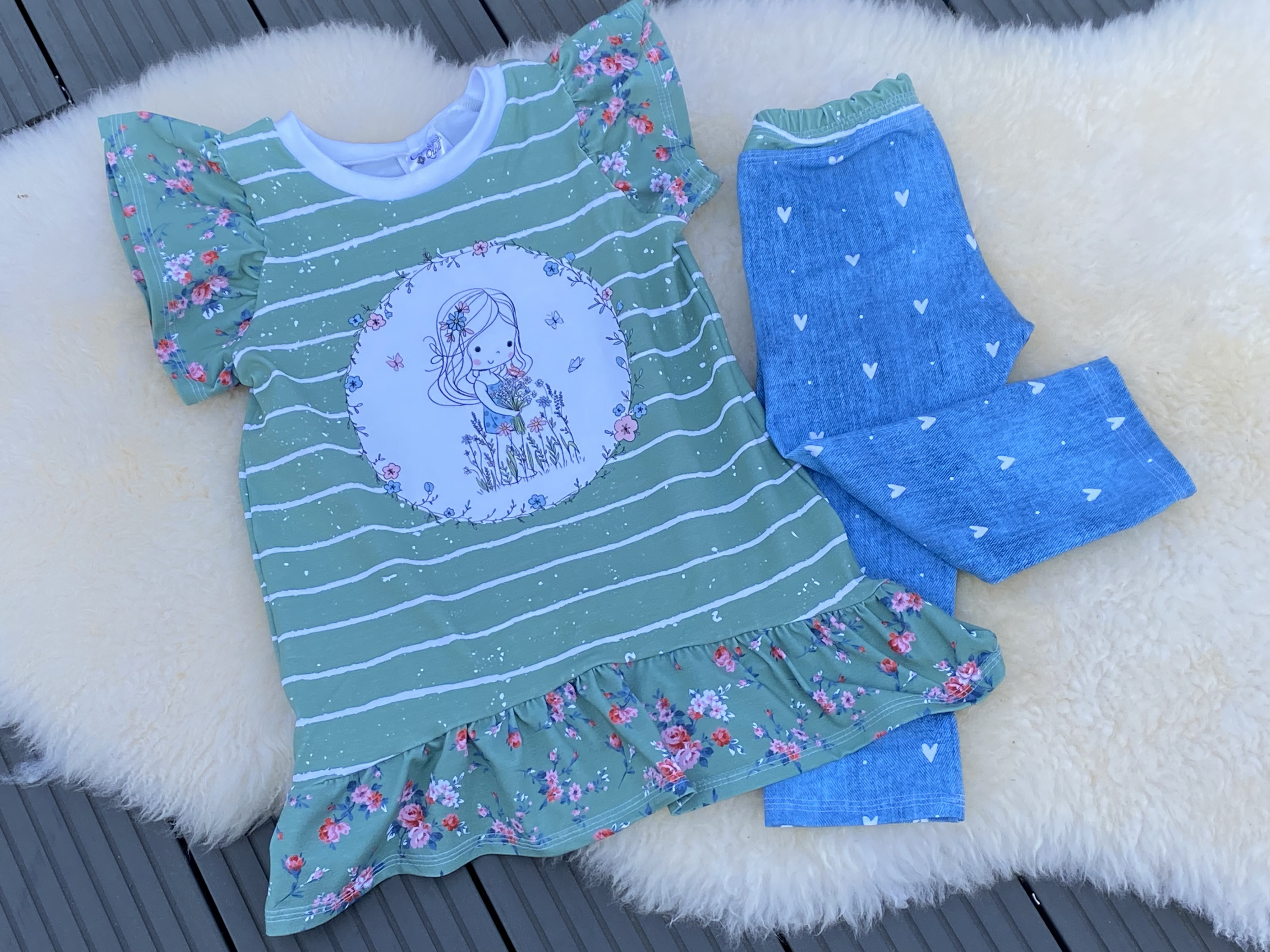 Schnitte sind von Schleiferlwerk - das Cutie Shirt, hier mit Rüschenärmeln und Rüschensaum. Die Cushy Legs einfach auf Radler-Länge gekürzt, hab ich schon öfter gemacht und die passt bei uns einfach perfekt.