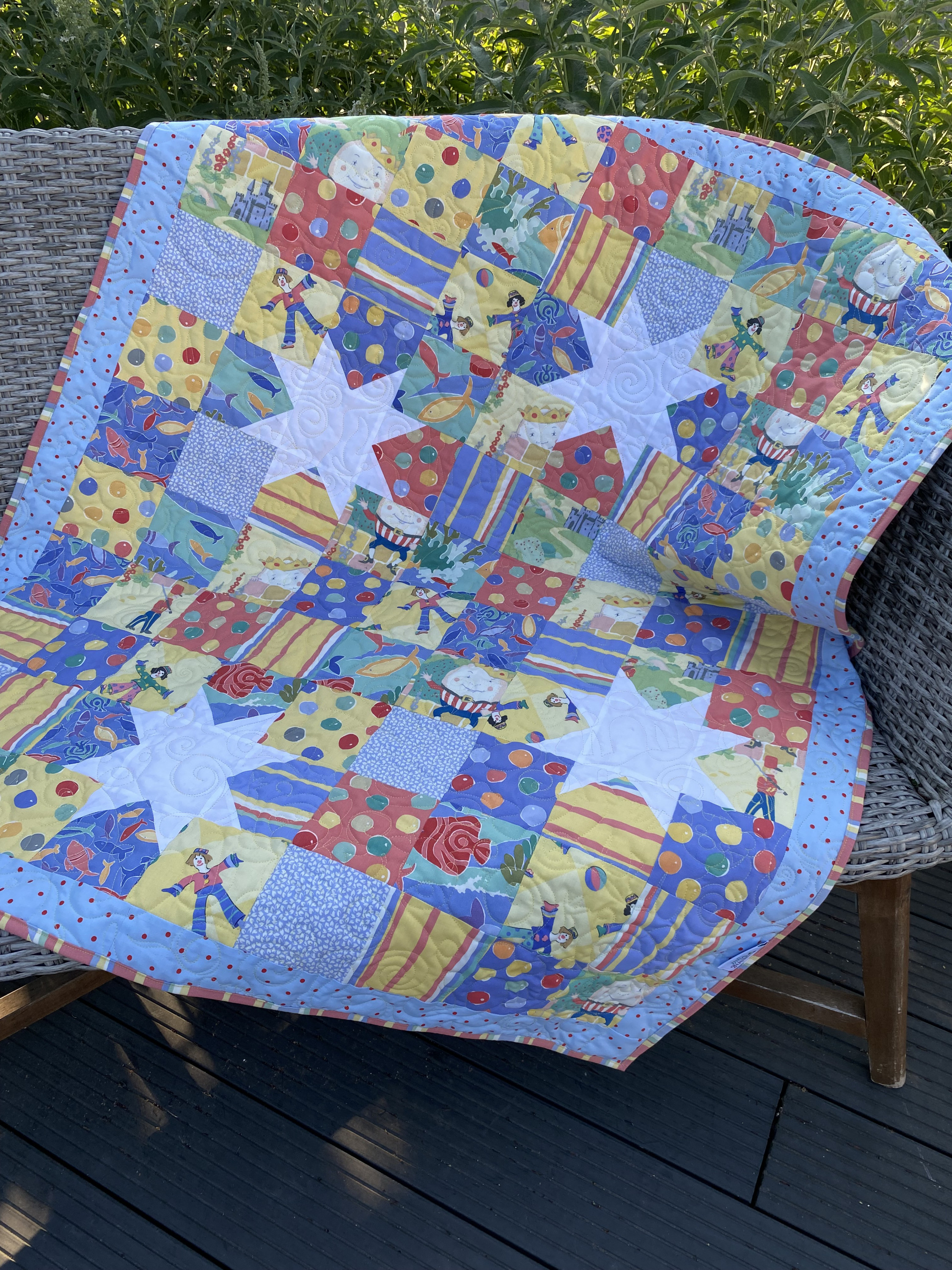 Alle Stoffe der Kundin sind verarbeitet worden, auch für die Rückseite. Ich habe nur ein wenig weiß ergänzt für die Sterne und das Volumenvlies. Gequiltet habe ich ein Zoo Motiv (Panto) allover in hellgelb.