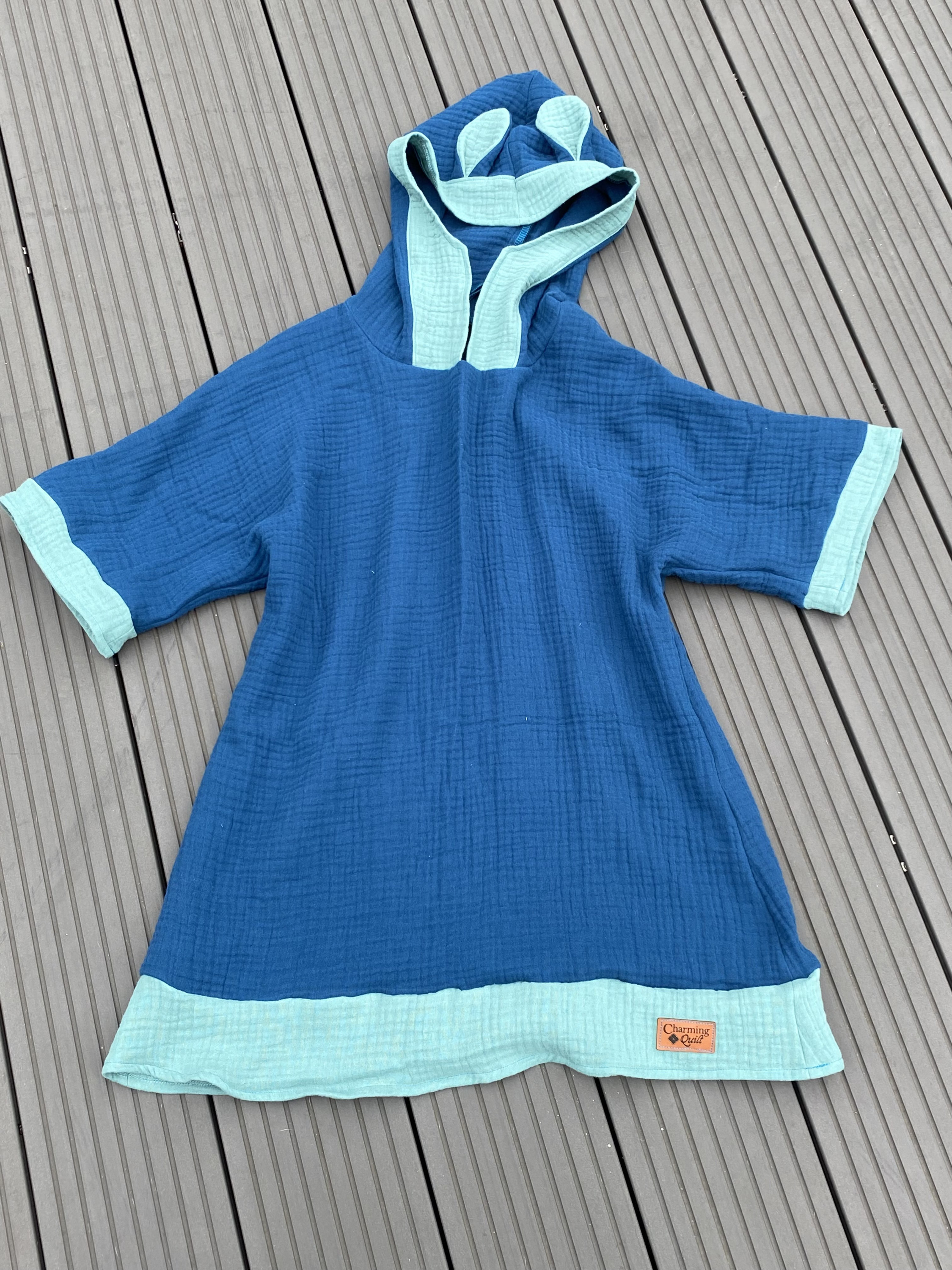 Mir hat besonders gefallen, dass er tailliert ist und nicht wirklich ein richtiger "Poncho". Der Schnitt ist schön weit, perfekt zum drüberziehen und geht bis fast ans Knie. Größe ist 134 und das Musselin ist von meiner Decken-Aktion übrig geblieben.