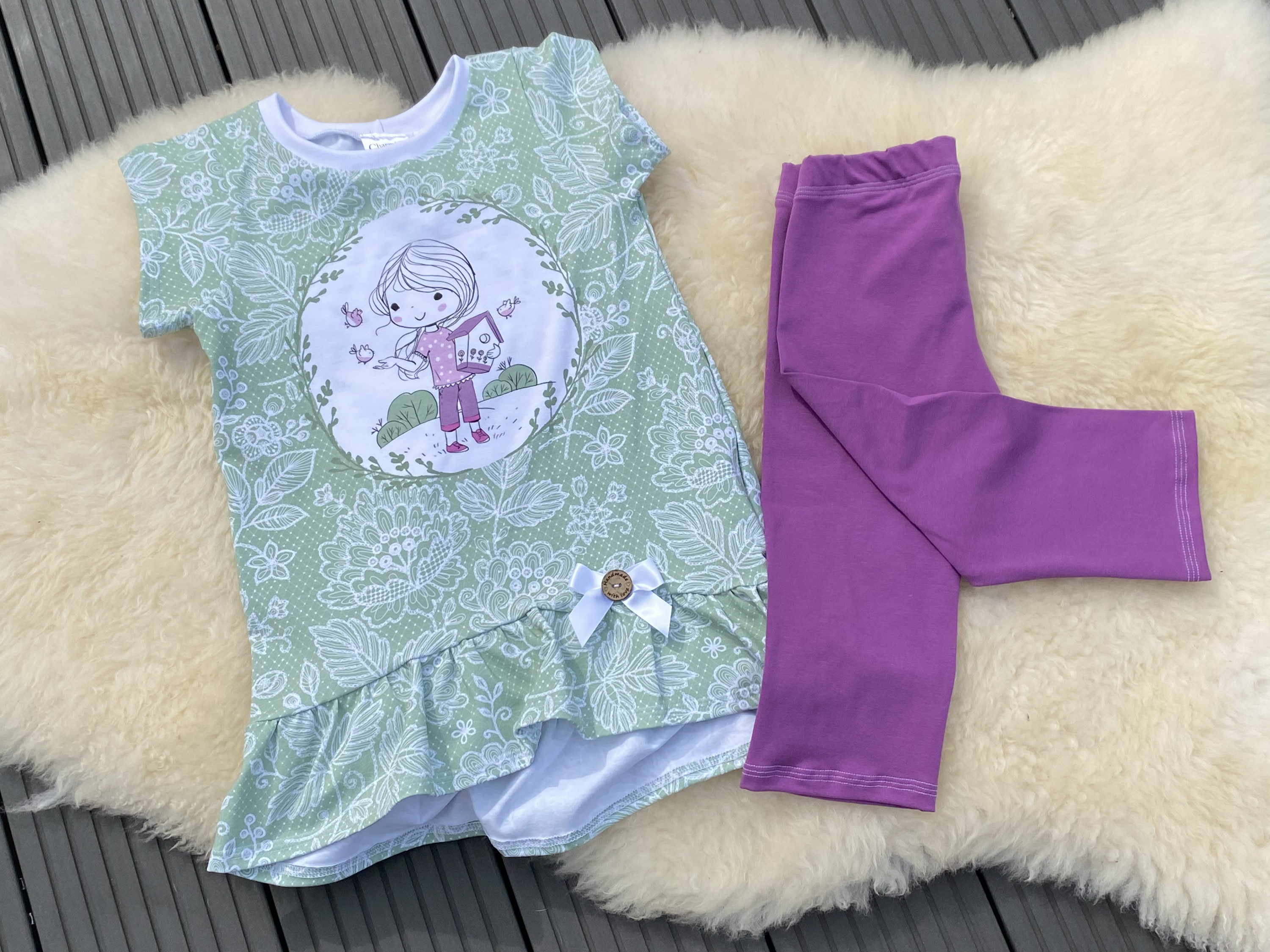 Genäht habe ich ein Cutieshirt mit Rüsche und normalen kurzen Ärmeln. Dazu eine Schleife und Knopf. Und eine Cushy Legs als Radler in lilapink - passend zum Motiv des Panels.