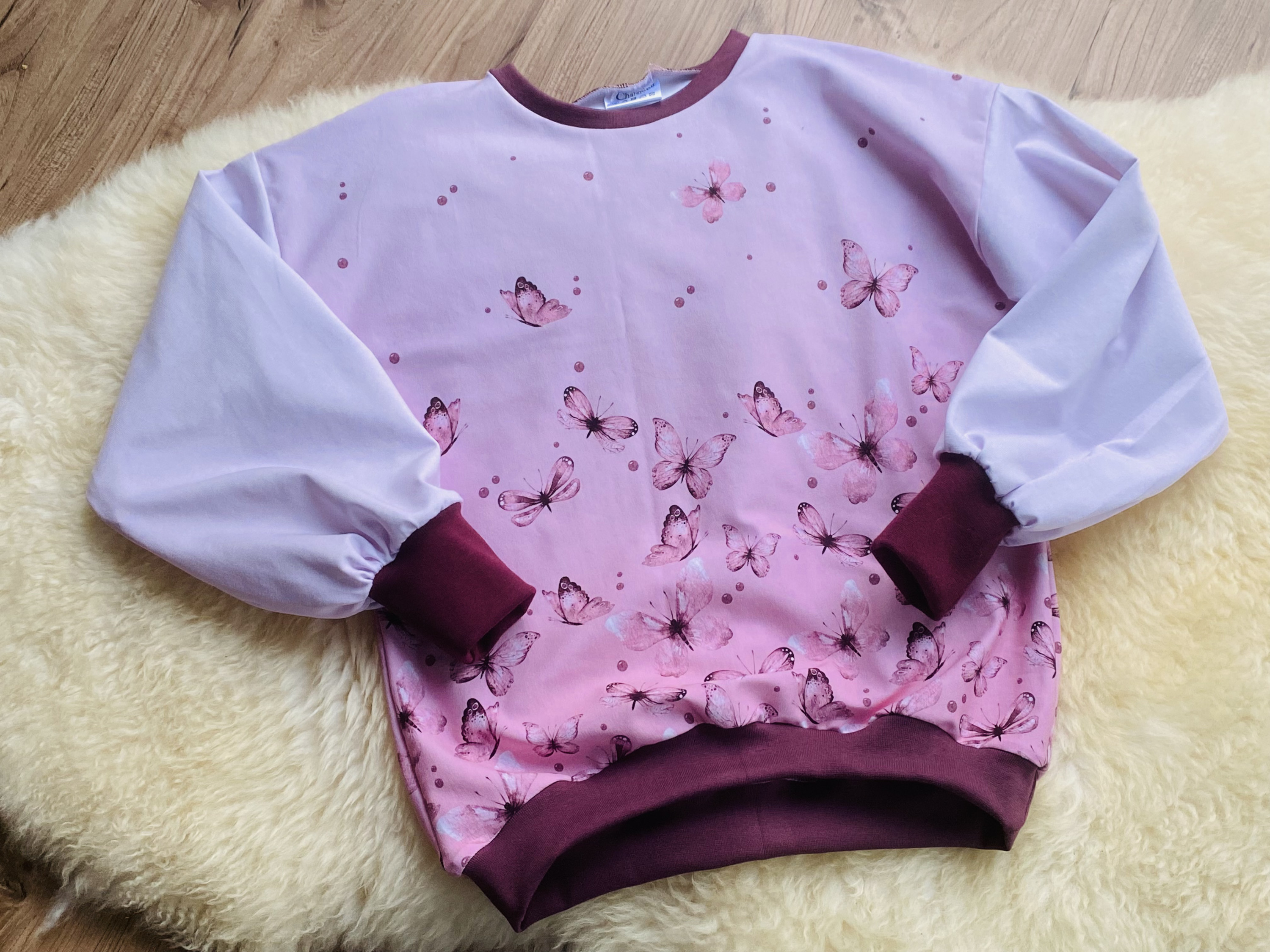 Der Schnitt ist Oversized Sweater von Lybstes in Größe 140. Genau nach Anleitung, mit Ballonärmeln, keine Änderungen.