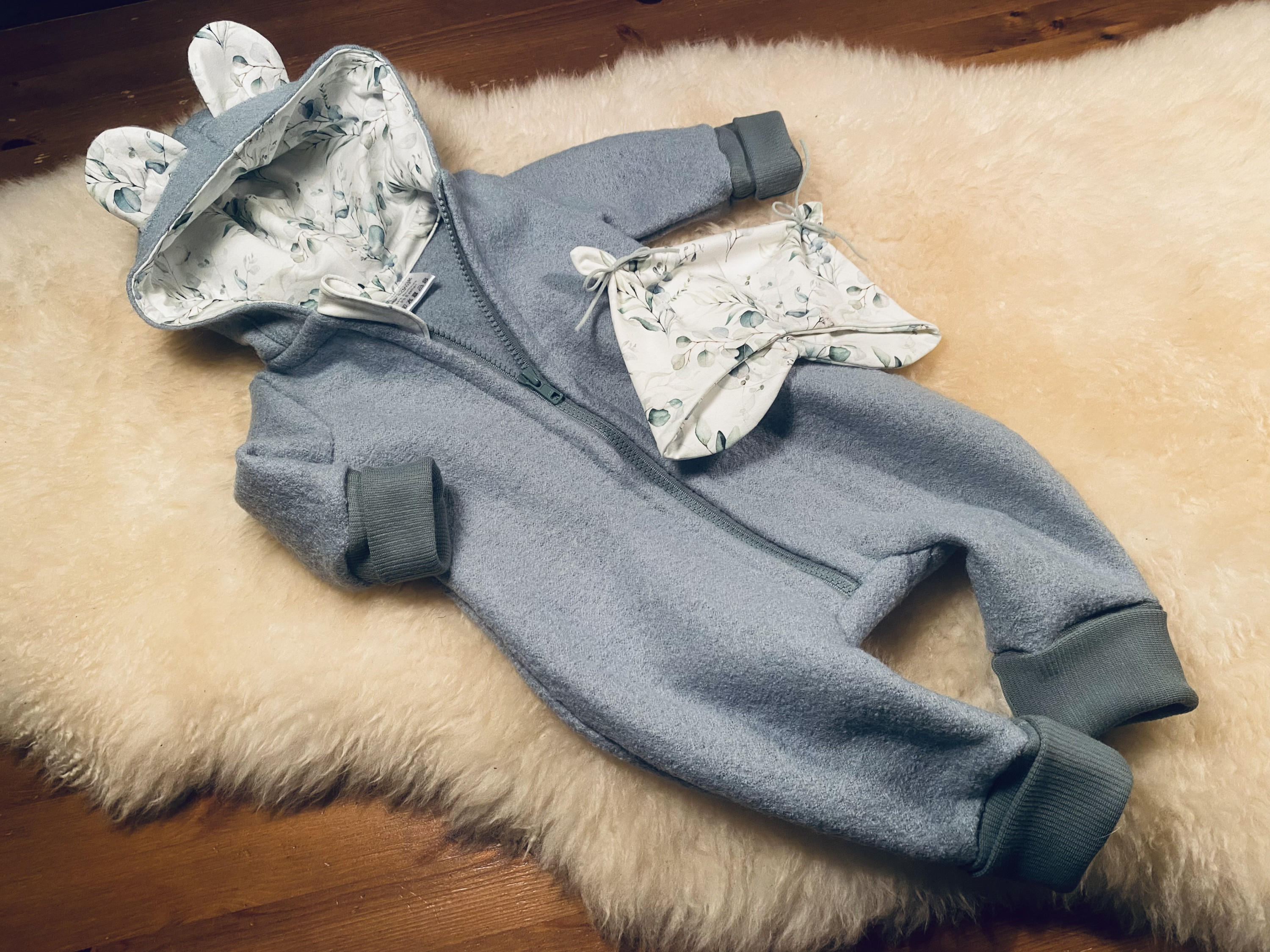 der erste Walkanzug ist fertig - dieser hier war ein Auftrag. In Größe 68 nach dem Schnitt Jolly Jumper Outdoor von Lybstes. Die Öhrchen hab ich selbst dran gebastelt, hat die Mama sich gewünscht.