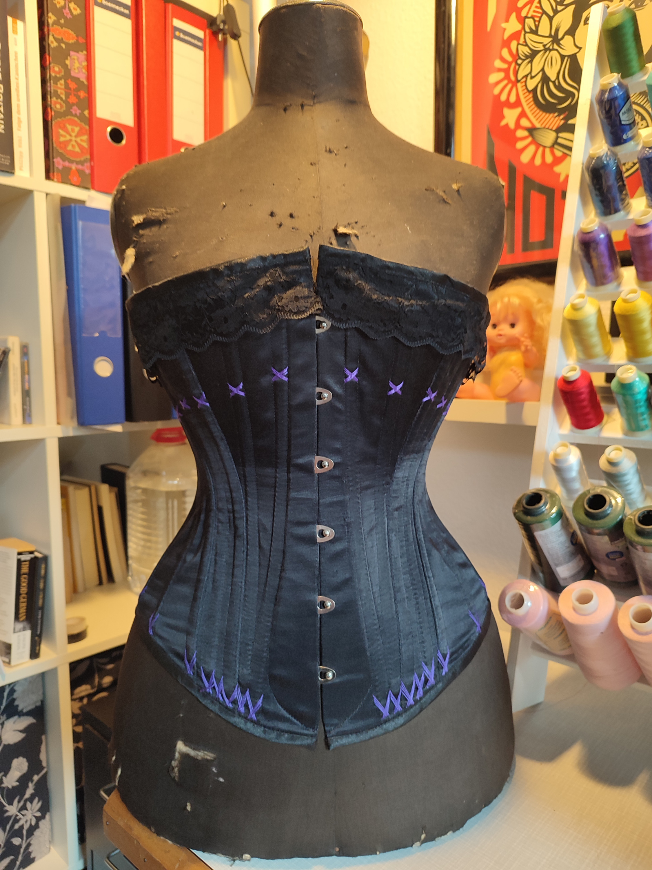 Korsett nach Original-Vorlage von ca. 1888, entnommen aus Fashions of the Gilded Age, Volume 1 von Frances Grimble. Präsentiert auf antiker Püppi.