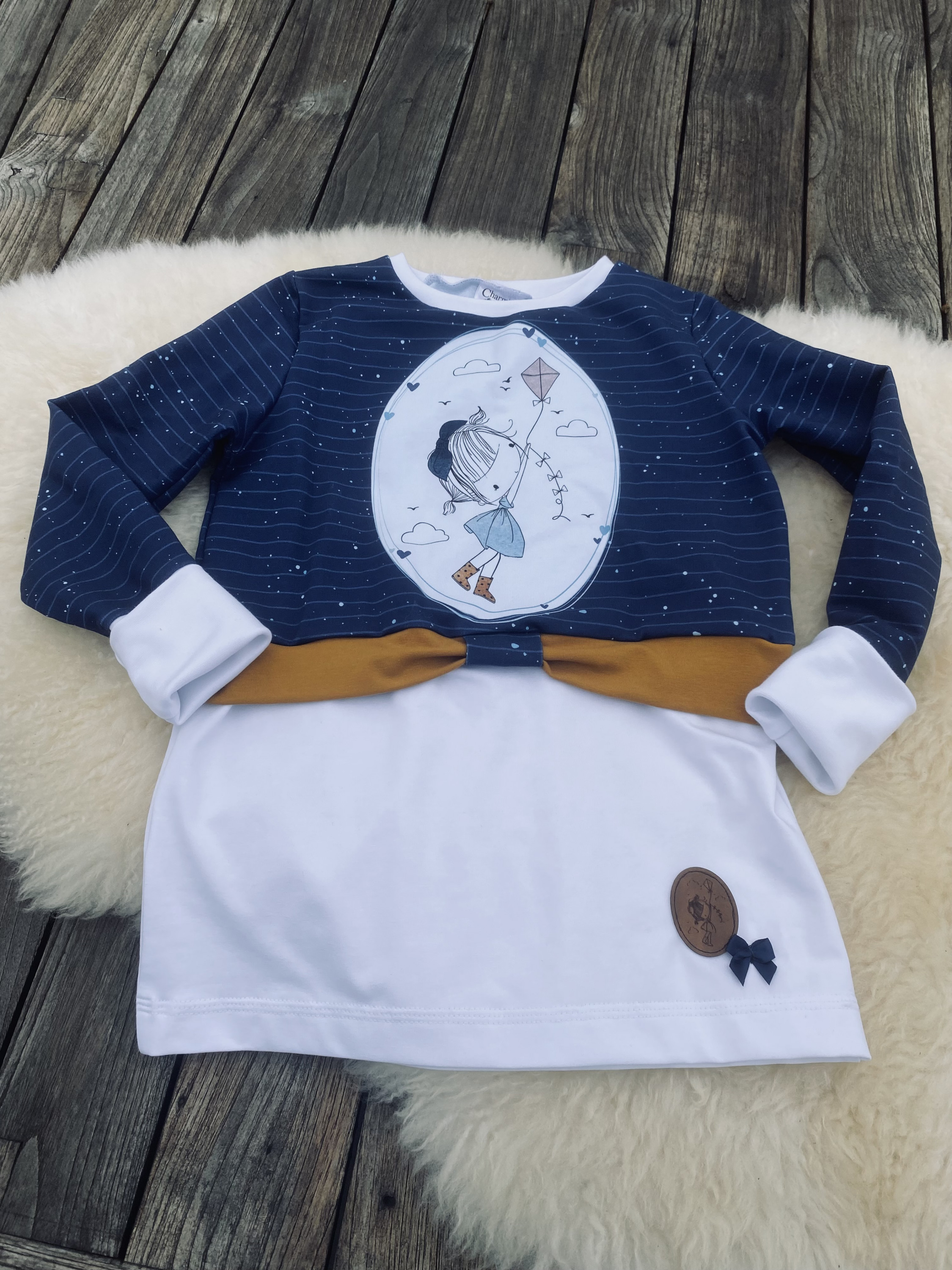Dieses Mal in Gr 134, aber mit dem geraden Saumteil und dem durchgehenden Bund mit Raffung. Dazu ein Lederlabel mit dem Motiv des Panels und natürlich eine Schleife. Auch hier wieder die extralangen Ärmelbündchen zum Mitwachsen.