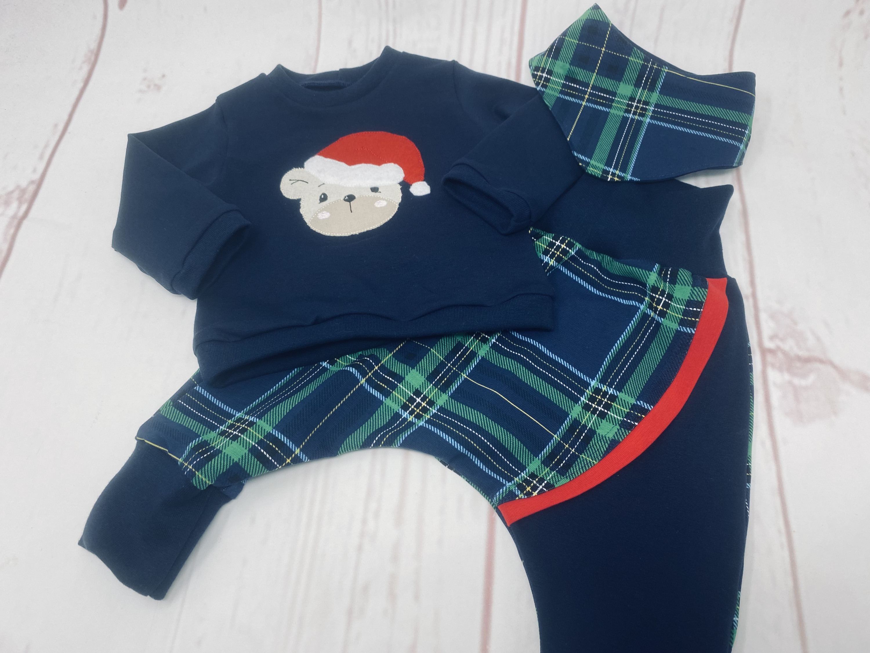 aus den "Resten" des Murmel Weihnachtsschlafanzuges habe ich dieses süße Set genäht: die Hose mit Teilungen und roter Paspel. Dazu ein dunkelblaues Shirt mit Nikolaus Stickerei und ein Halstuch zum Wenden.
