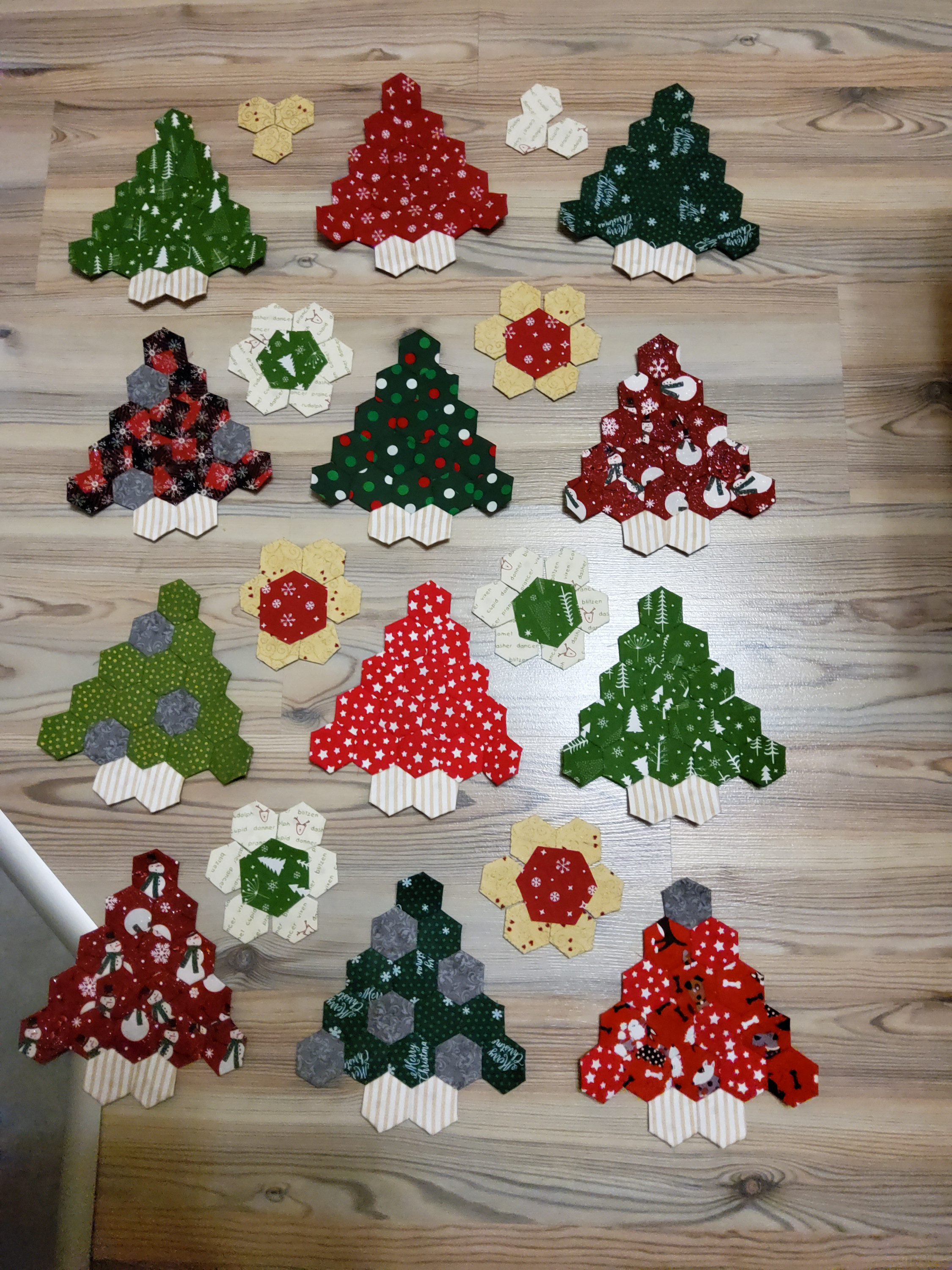 Das Bild habe ich gerade noch auf dem Tablett gefunden, es zeigt den Stand Vom 31.12.2022 und ich muss leider zugeben, dass ich nicht wirklich weiter bin. Zwischen die Bäume sollen helle Hexis und der Rand besteht dann noch mal aus roten und grünen und hellen, je nachdem, wie der Stoff reicht.
