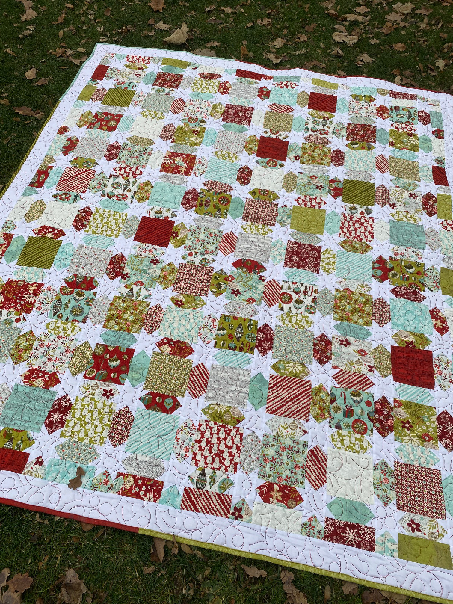 Die Stoffserie heißt Aspen Frost und war von Moda. Die Anleitung für das Top ist von der Missouri Star Quilt Company und gequiltet wurde ein Panto mit Mistelzweigen in weinrot.