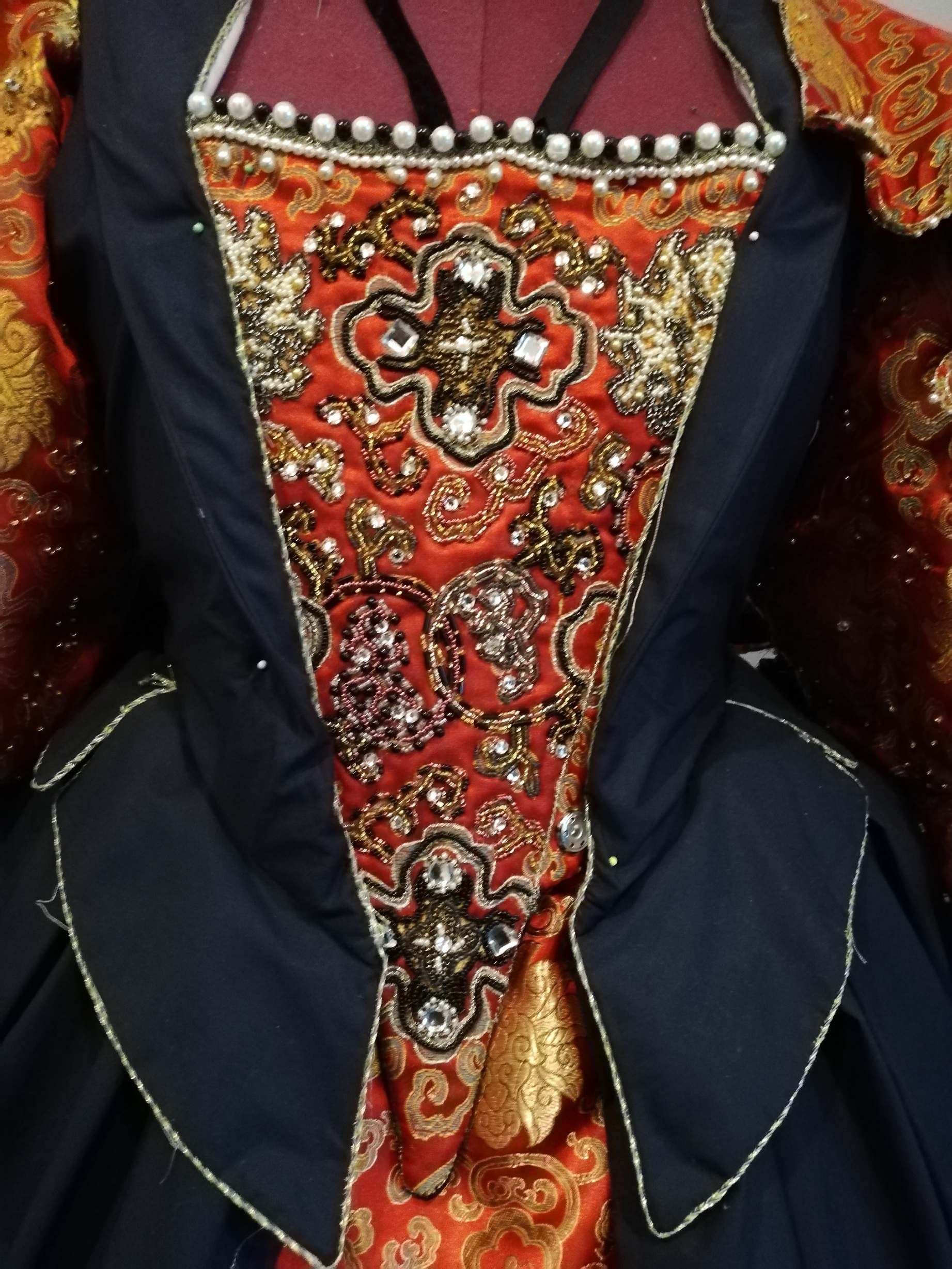 Dies ist ein Stomacher oder Vorstecker, der in die Öffnung des Übergenwandes mittels Nadeln eingesteckt wird. Bei diesem Modell ist die Schnürung des Gewandes nicht sichtbar.