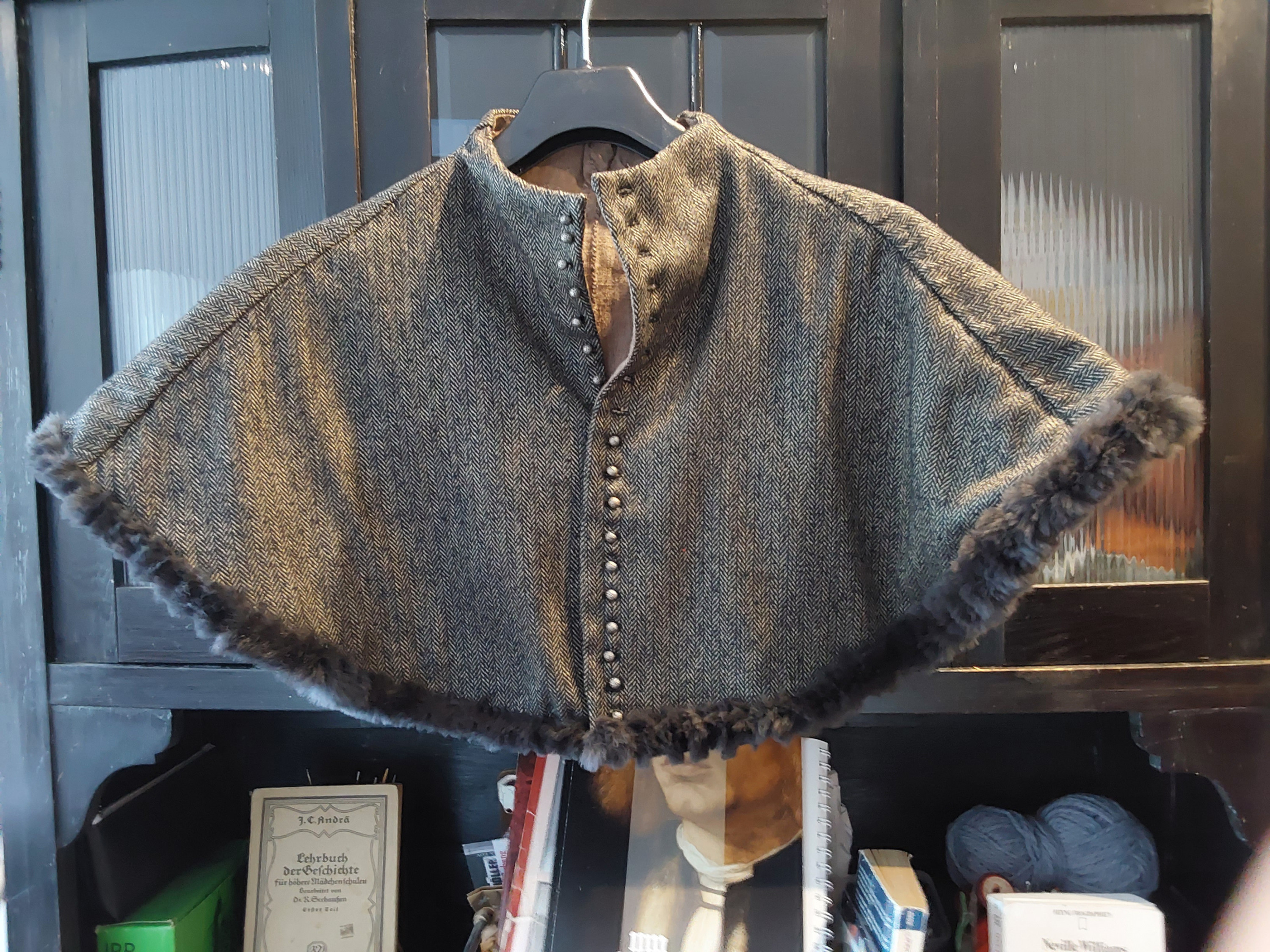 Der Stoff ist nicht ganz korrekt, aber wunderschön. Das Foto wird ihm nicht gerecht. Es ist eine Woll-Seiden-Mischung mit einer kleinen Kolonie Polytierchen. Seideig-weich, herrrlich! Gefüttert mit Leinenresten (Piecing is period), verbrämt mit Pelzresten, die noch so rumflogen und zu schließen mit einem Schwung winziger Messingkugelköpfe, die ich günstig geschossen hatte.
