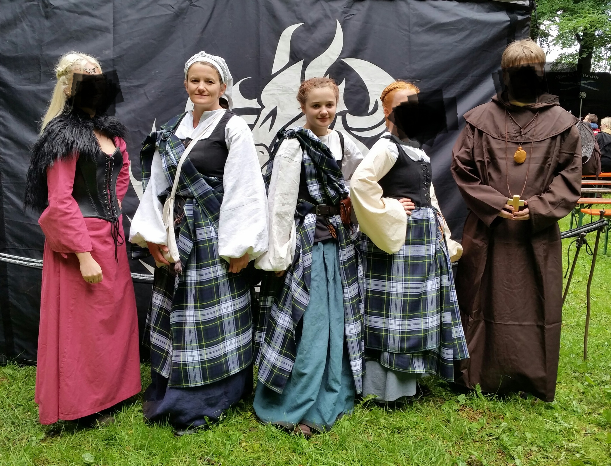 Meine Tochter und ich (ohne "Maske") wollten Mittelalter in Schottland. Natürlich ist mir bewusst (bevor der Aufschrei bei Kundigen kommt), dass es zu der Zeit den Tartan in dem Sinne noch nicht so gab. Wir haben das dennoch so gemacht, da es sonst niemand erkannt hätte. Vertrackte Situation.