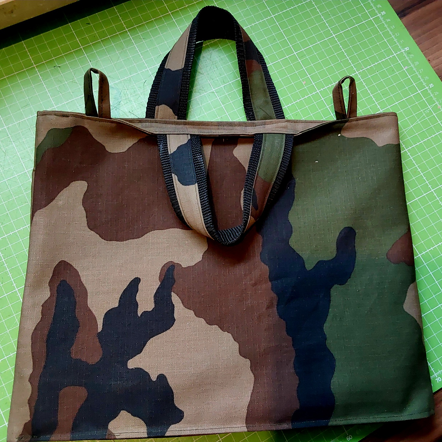 Hier habe ich einen Taschenschnitt aus dem Internet für mich abgewandelt. Die Ösen sind zum Einhängen an z. B. Karbinern, die Träger aus Gurtband machen es zu einer multifunktionellen kleinen Tasche, die man auch im Zeltinnern aufhängen kann (für Handys usw) oder mit ins Duschhaus nehmen kann.