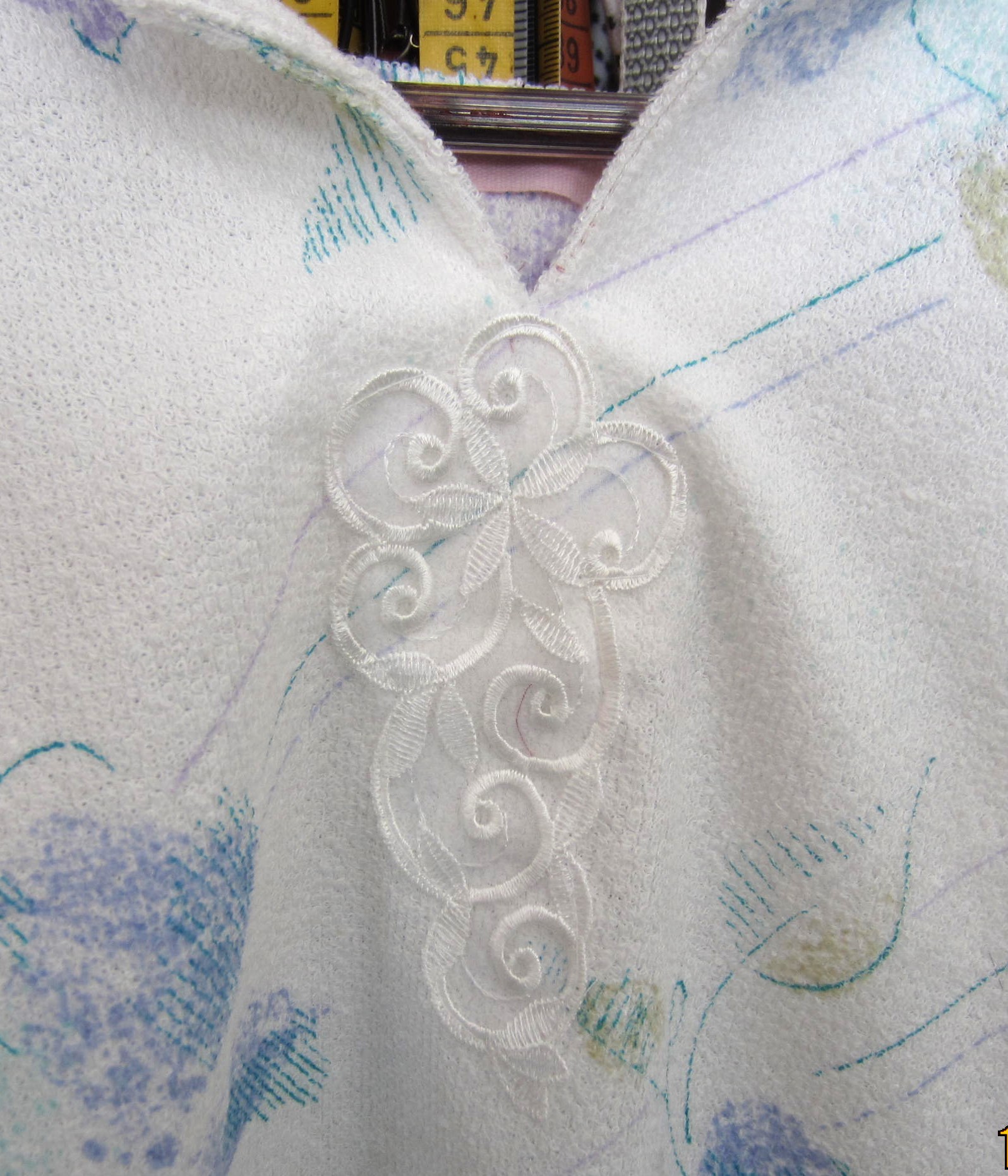 Die Applikation am Ausschnitt hat keinen dekorativen Grund - ich hatte den Schlitz zu tief eingeschnitten. Von hinten Gewebeeinlage aufgebügelt, vorne gibt die Applikation hoffentlich etwas Stabilität.