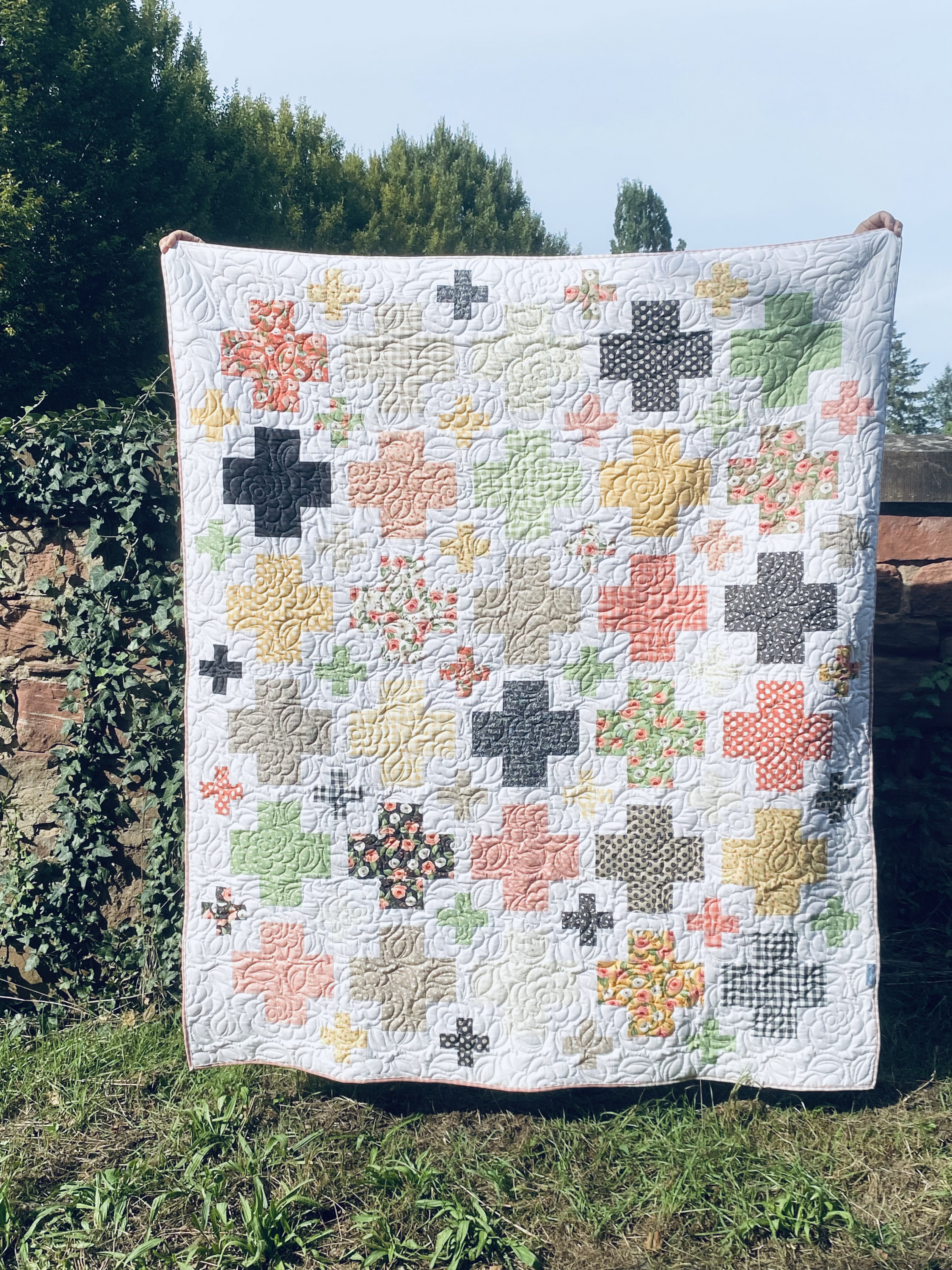 Anleitung ist von Jessica Dayon "Positive Side" und die Stoffe waren ein Layer Cake von Lella Boutique. Rückseite ist Wellnessfleece in rosa und das Quilting ist wieder ein Panto, dass perfekt zu den Stoffen passt mit Rosenmuster.