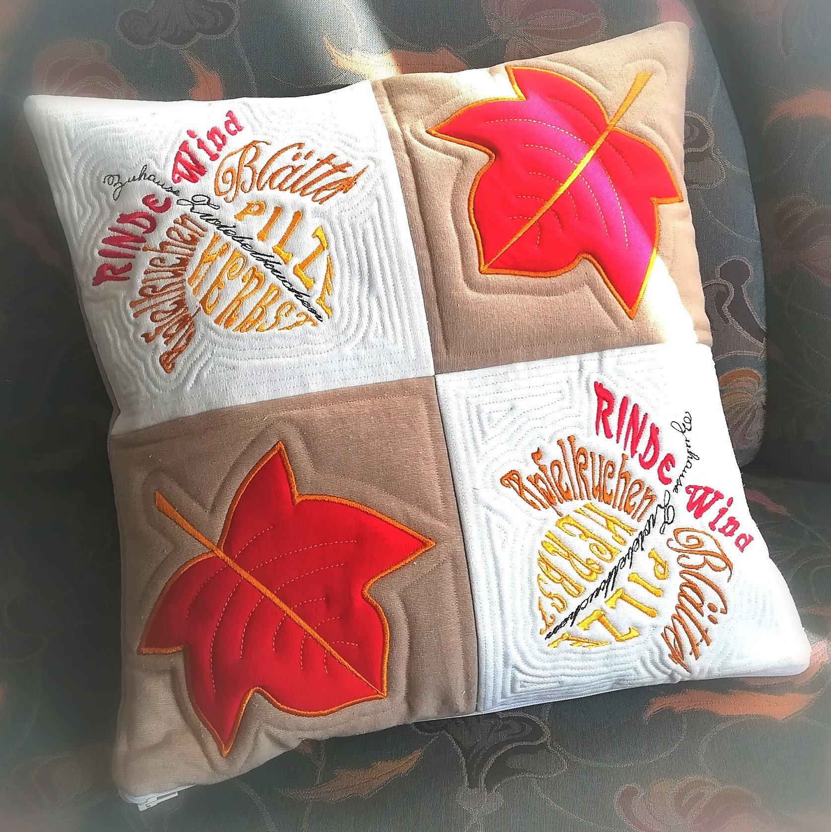 Hier habe ich mal ein paar Experimente mit Blatt-Applikationen und Echoquiltumrandung für ein paar Kissen und Tischläufer gemacht.