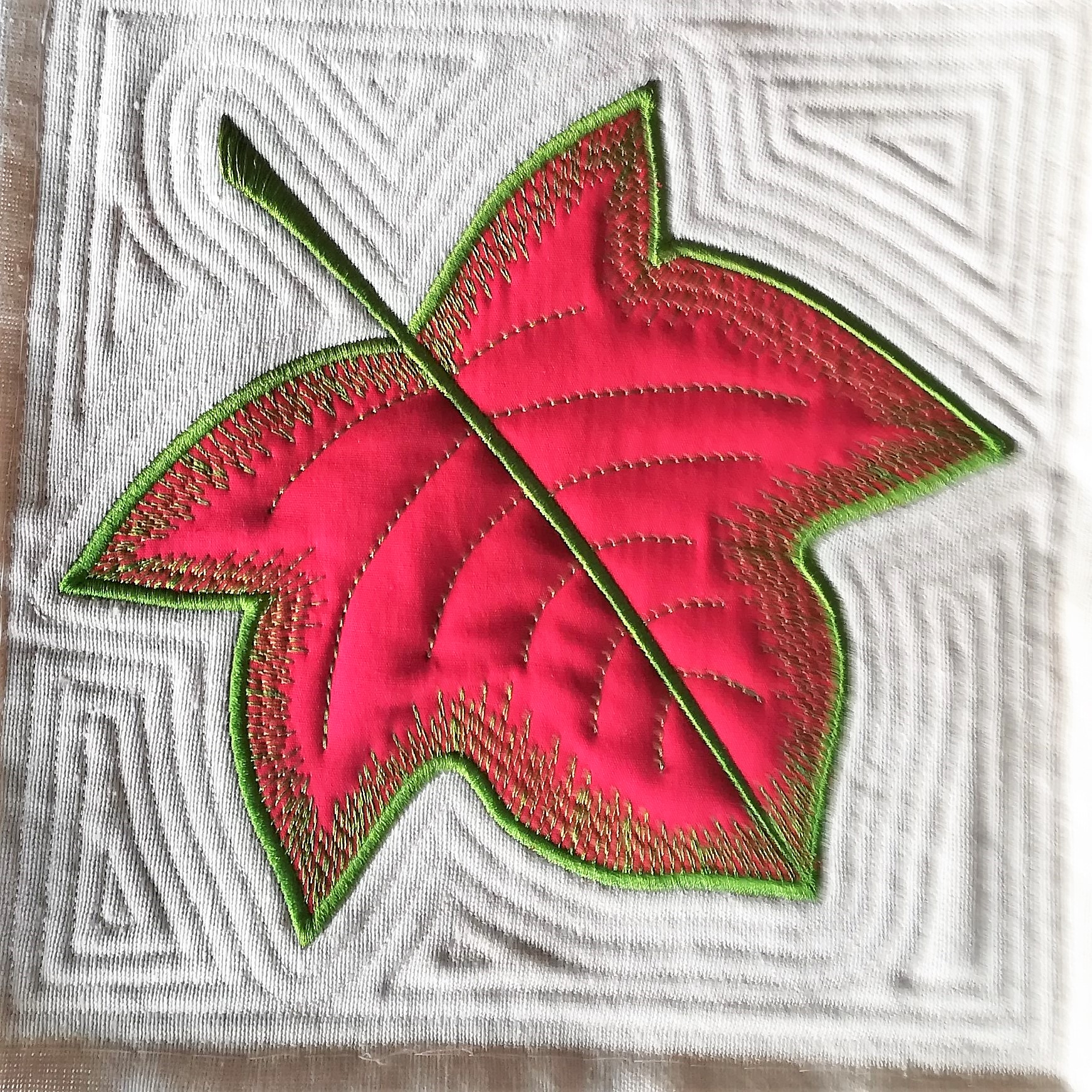 Hier habe ich mal ein paar Experimente mit Blatt-Applikationen und Echoquiltumrandung für ein paar Kissen und Tischläufer gemacht.