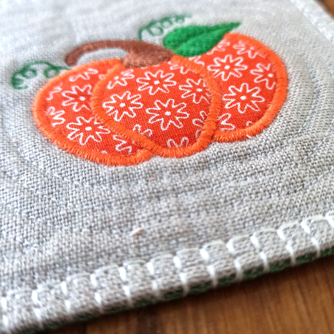 Noch sind meine Kürbisse in der Reifephase, aber bald kann ich diese Schätze zu Köstlichkeiten werden lassen. Also freue ich mich darauf und habe mit der Stickdatei, die ich in den Freebies hochgeladen habe, zwei Untersetzer gestickt, einer mit Echoquiltumrandung, eine ohne.