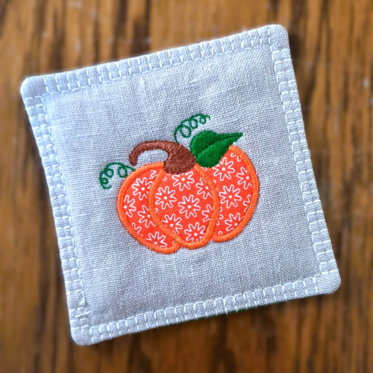 Noch sind meine Kürbisse in der Reifephase, aber bald kann ich diese Schätze zu Köstlichkeiten werden lassen. Also freue ich mich darauf und habe mit der Stickdatei, die ich in den Freebies hochgeladen habe, zwei Untersetzer gestickt, einer mit Echoquiltumrandung, eine ohne.