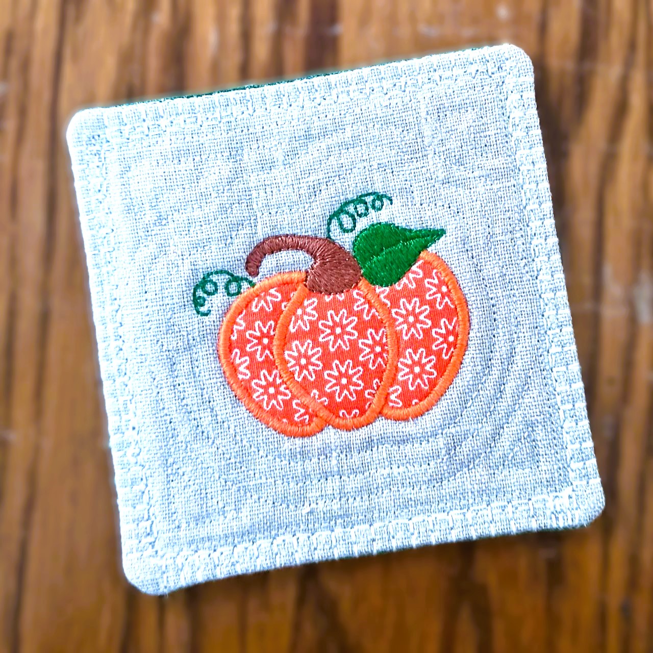 Noch sind meine Kürbisse in der Reifephase, aber bald kann ich diese Schätze zu Köstlichkeiten werden lassen. Also freue ich mich darauf und habe mit der Stickdatei, die ich in den Freebies hochgeladen habe, zwei Untersetzer gestickt, einer mit Echoquiltumrandung, eine ohne. Gestickt mit Madeira Baumwollstickgarn Cotona 30 mit der V3 auf Leinen. Vlies: Sojavlies.