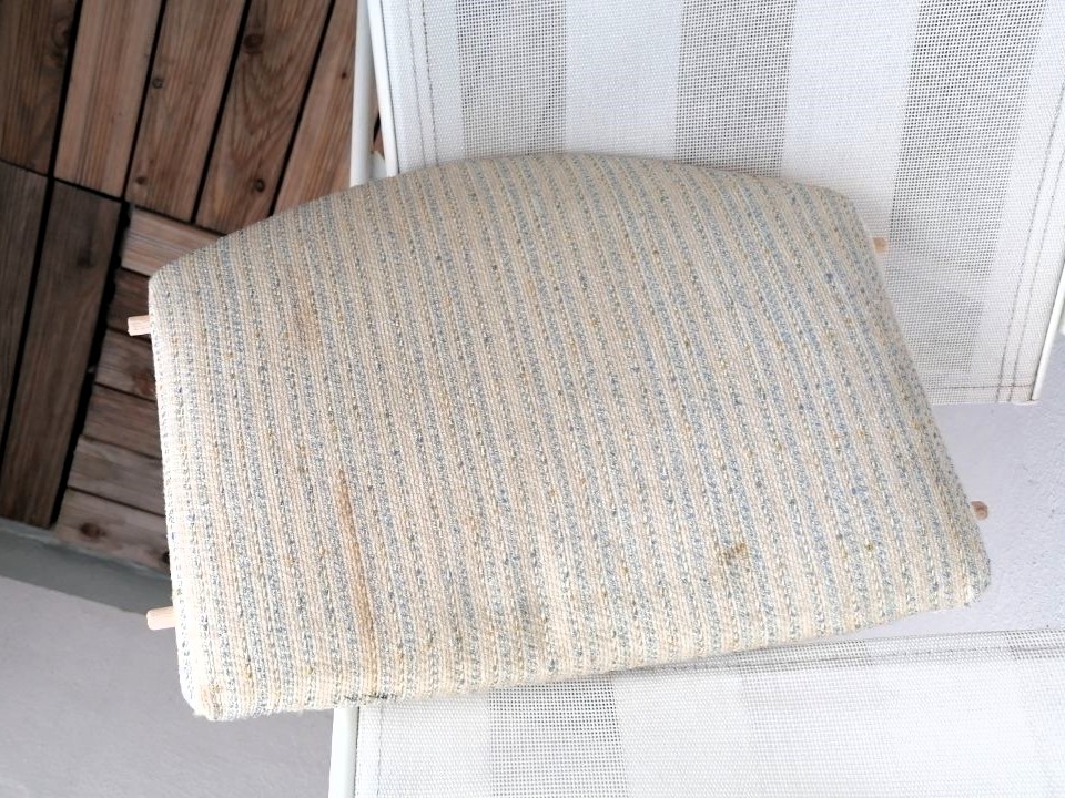 Hab ich noch nicht probiert, also gehe ich davon aus, das ich das kann. Hier schon mal ein paar Bilder zum Verlauf. Erster Bezug ist nachdem erfolgreichen Probebezug mit oller Baumwolle fertig und muss nur noch unten angetackert werden. Vorher mussten allerdings die Holzdübel abgesägt werden und die Reste herausgebohrt, denn sie waren sehr fest verleimt. Die alte Polsterung ist herausgebröselt.