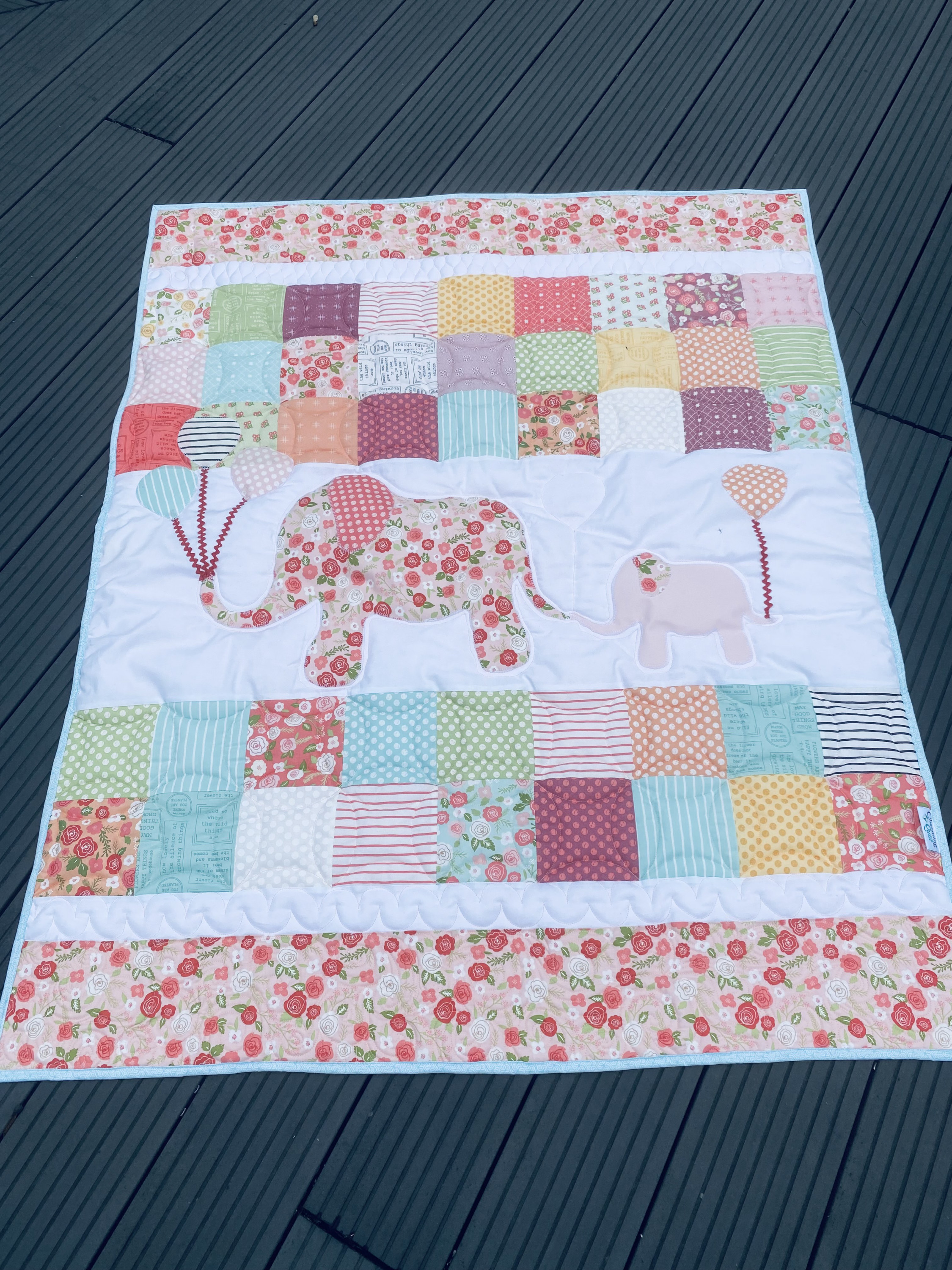 hier endlich der süße Mommy & Me Quilt mit den Elefanten. Lag lange ungequiltet im UFO Stapel - ich freue mich, dass er endlich fertig ist. Bin selbst total verliebt. Ich mag die Anleitung total gerne und lässt sich auch super arbeiten und viel Spielraum für Quiltideen.