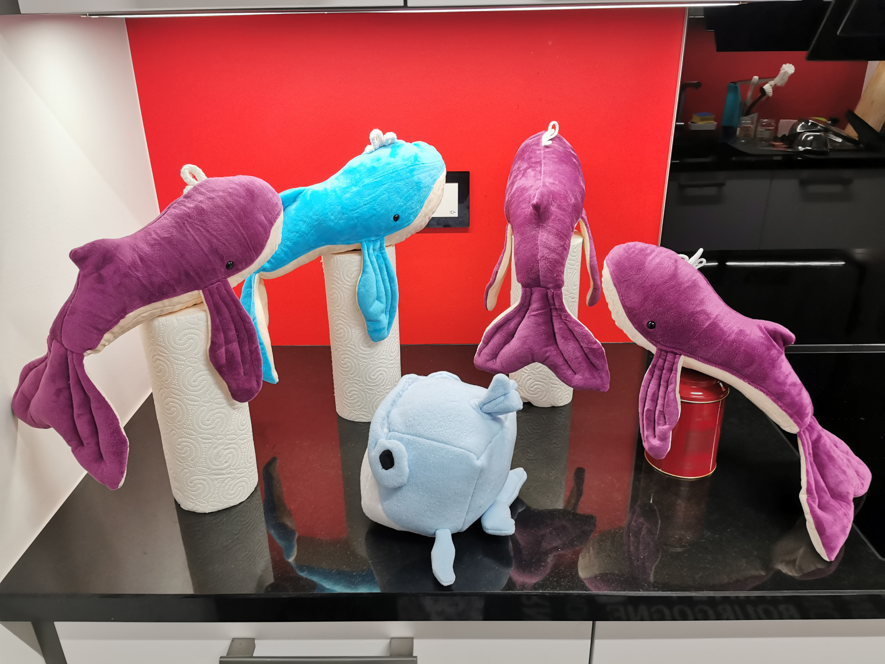 Ich weiß noch nicht, wie das hier gegliedert wird. Ich habe das ca. in der Entstehungsreihenfolge geposted. Es fing mit dem kleinen blauen viereckigen Wal an, und ging dann zu den rosa und blauen schönen Walen über. Einen in Rosa habe ich behalten =) Der Rest ging an Kinder. Die grünen Wale sind die ersten Dinge, die ich mit der neuen Nähmaschine genäht habe. Sind also die letzten Plüschtiere.